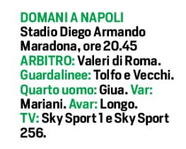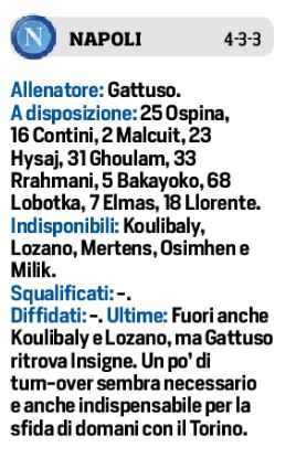 Domani sera alle ore 20,45 allo stadio Diego Armando Maradona, il Napoli vorrà chiudere il 2020 con un successo contro il Torino. Gli azzurri dovranno fare a meno degli infortunati Koulibaly, Lozano, Mertens e Osimhen. Le novità sono Meret in porta e Demme a centrocampo al posto di Bakayoko. Per i granata out Ansaldi, Murru e si aggiunge la punta Bonazzoli. Squalificato il difensore Lyanco. In porta ancora spazio a Milinkovic-Savic, fratello del centrocampista della Lazio. Ritorna dalla squalifica Singo, mentre in attacco spazio a Lukic, Verdi e Belotti, con Zaza in panchina.