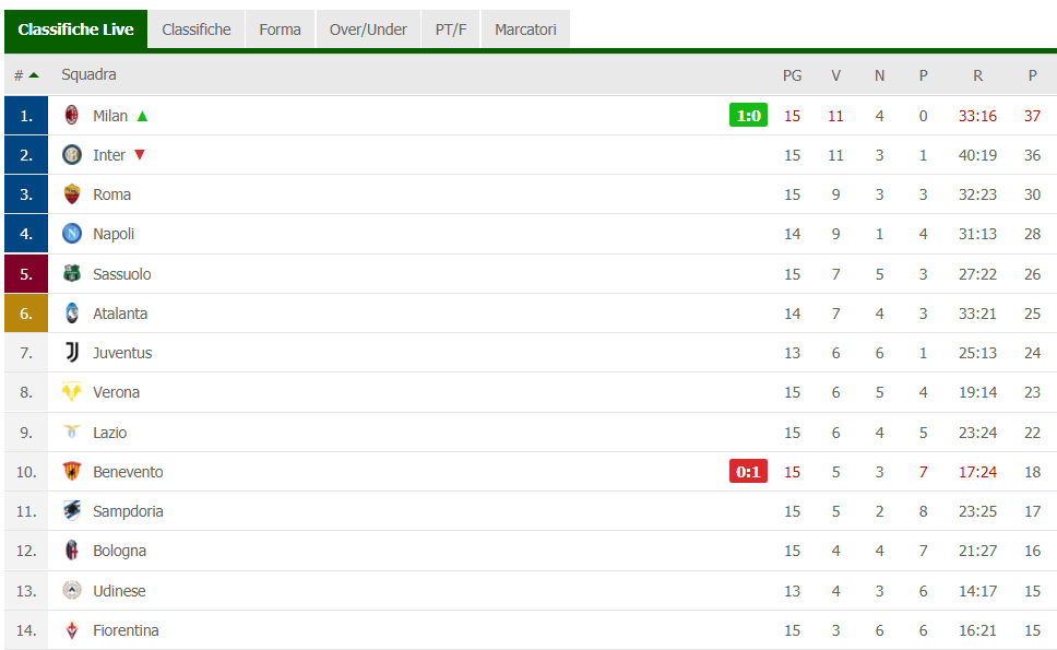 Classifica Serie A – Quarto posto saldo per gli azzurri