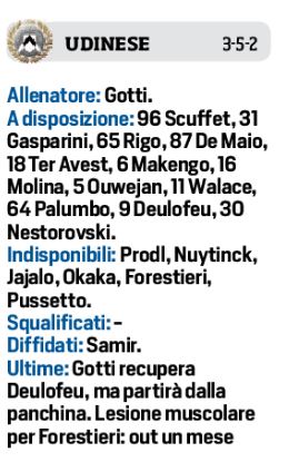 Domani alle ore 15,00, alla “Dacia Arena”, l’Udinese cercherà punti importanti tra le mura amiche contro il Napoli in cerca di riscatto. Per i friulani arriva una buona notizia dall’infermeria, recupero in extremis di Deulofeu, attacco che vedrà il solo Lasagna in avanti, al suo fianco Pereyra. A centrocampo spazio al “napoletano” Mandragora e all’eroe di Bologna Arslan. In casa azzurra possibile convocazione per Koulibaly in difesa, tra i pali spazio all’ex di turno Meret, con Rrahami che ha chance per giocare titolare. A centrocampo si proverà a recuperare Demme, ma partirebbe dalla panchina, infine in attacco Petagna centravanti e Lozano esterno destro.