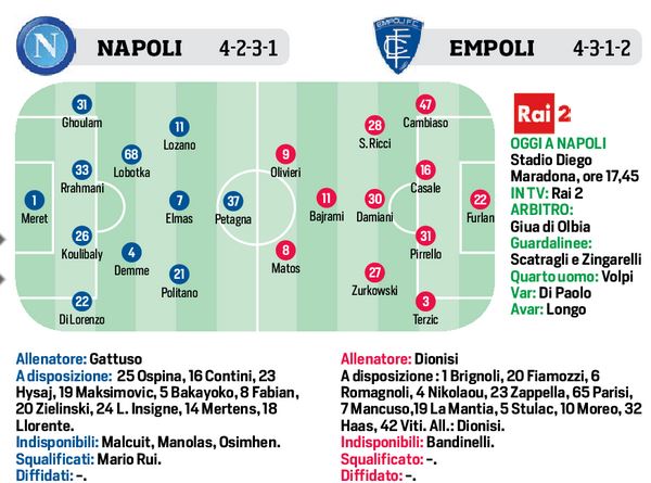 [Formazioni] Ore 17,45 – Coppa Italia -Napoli/Empoli, torna K2 in difesa. Attacco dei toscani con il giovane Olivieri