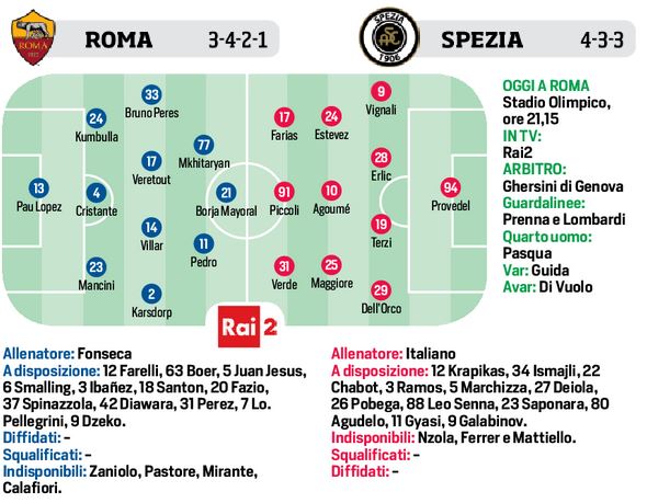 (21,15)Coppa Italia – Roma – Spezia: le probabili formazioni del CdS. Dove vedere la gara