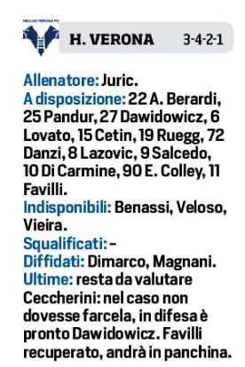 Domenica alle ore 15,00 allo stadio “E. Bentegodi” sfida tra l’Hellas Verona e il Napoli per l’ultima gara del girone d’andata. Per gli scaligeri occasione per riscattare la sconfitta di Bologna e Juric sta pensando ad una squadra spregiudicata. Barak e Zaccagni alle spalle di Kalinic. Dubbio in difesa dove si valuteranno le condizioni di Ceccherini. In casa azzurra qualche cambio dal primo minuto. In porta Meret favorito rispetto ad Ospina, mentre a sinistra Hysaj dovrebbe spuntarla su Mario Rui. Per il resto la stessa squadra che ha giocato contro la Juventus in Supercoppa italiana, ma con tanta voglia di rivalsa in campionato.