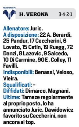 Domani allo stadio “Bentegodi” di Verona, i gialloblu affronteranno il Napoli, per l’ultima del girone d’andata di campionato. Per il tecnico degli scaligeri Ivan Juric, arrivano buone notizie dall’infermeria, recupero di Tameze a centrocampo, mentre c’è un dubbio in difesa. Davidowicz favorito su Ceccherini non al meglio. Per il resto Barak e Zaccagni, obiettivo del club azzurro, alle spalle di Kalinic. Per Gattuso, quasi l’undici migliore, con due novità. In porta Meret al posto di Ospina e Hysaj favorito su Mario Rui.