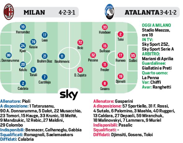 Il Milan si presenta con il 4-2-3-1, Gasperini propone i l suo 3-4-1-2. Per seguire la gara sintonizzarsi su Sky sport 252 o Sky Sport Serie A