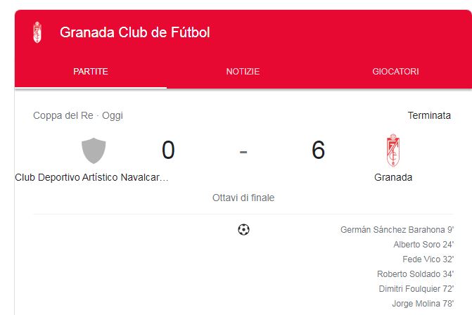 L’eurorivale del Napoli, il Granada, strapazza il Navalcarnero agli ottavi di finale di Copa del Rey. I biancorossi si sono imposti sul club di terza divisione spagnola con un netto 6-0 grazie alle reti di Sanchez al 9′, Soro al 24′, Fede al 32′, Soldado al 34′, Foulquier al 72′ e Molina al 78′. Quarti di finale, dunque, conquistati. da TMW