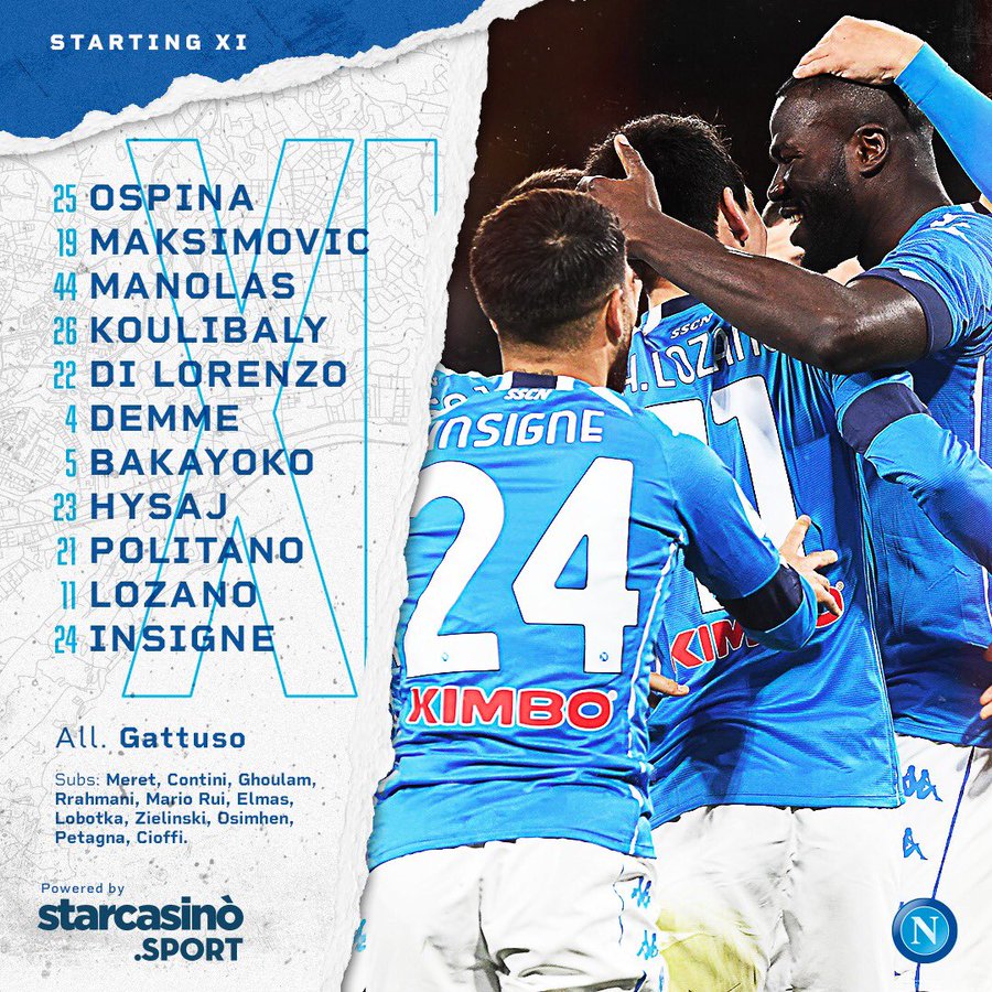 NAPOLI (3-4-3): Ospina; Maksimovic, Manolas, Koulibaly; Di Lorenzo, Bakayoko, Demme, Hysaj; Politano, Lozano, Insigne. All. Gattuso
