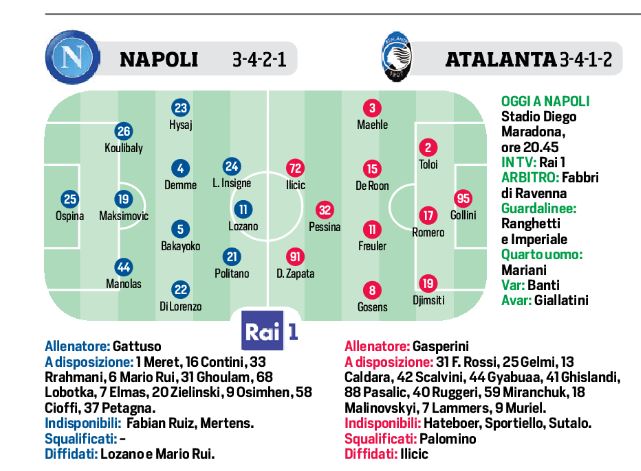 Questa sera allo stadio Diego Armando Maradona, fischio d’inizio alle ore 20,45, il Napoli affronterà l’Atalanta, per la semifinale d’andata di Coppa Italia. Per il tecnico degli azzurri Gattuso c’è la possibilità di schierare la difesa a tre: Maksimovic, Manolas e Koulibaly. Possibile panchina quindi per Zielinski ed Elmas. In attacco spazio a Politano, Lozano, falso nueve, e Insigne, Petagna dovrebbe partire dalla panchina. Per Gasperini recupero in difesa di Romero, dopo la vicenda dei tamponi, Gonsens sulla fascia sinistra e Pessina giocherà alle spalle delle punte Ilicic e Zapata.