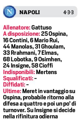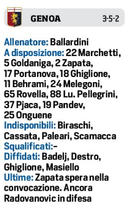 Domani sera allo stadio “Luigi Ferraris” di Genoa, i rossoblù di Ballardini, affronteranno il Napoli per la seconda giornata di ritorno di campionato. Per il tecnico dei grifoni, sarà 3-5-2, con il dubbio in attacco Shomurodov, affaticamento muscolare, al suo posto pronto Pjaca o Pandev. Per il resto Radovanovic al centro della difesa e Strootman avrà le chiavi del centrocampo assieme a Badelj. In casa azzurra alcuni cambi. In porta Meret avanti su Ospina. I centrali dovrebbero essere Koulibaly e Maksimovic, Di Lorenzo e Hysaj ai lati. A centrocampo Bakayoko in vantaggio su Elmas assieme a Demme e Zielinski. Infine in attacco dipende da Insigne, ma stavolta il capitano dovrebbe partire dalla panchina.