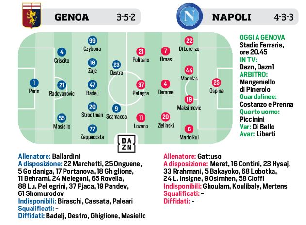 Questa sera allo stadio “Luigi Ferraris” di Genova, i padroni di casa di Ballardini affronteranno il Napoli per la seconda giornata del girone di ritorno. Per i rossoblù c’è un dubbio in attacco, Shomurodov ancora si allena a parte è dovrebbe partire dalla panchina. Al suo posto Scamacca al fianco di Destro. Assenti anche Biraghi in difesa e Cassata a centrocampo. Gattuso invece dovrà fare a meno di Koulibaly e Ghoulam causa Covid-19, Fabian Ruiz ancora non al meglio e infine Mertens infortunato. Insigne partirà dalla panchina, al suo posto pronto Politano. Infine in porta ancora Ospina favorito su Meret.