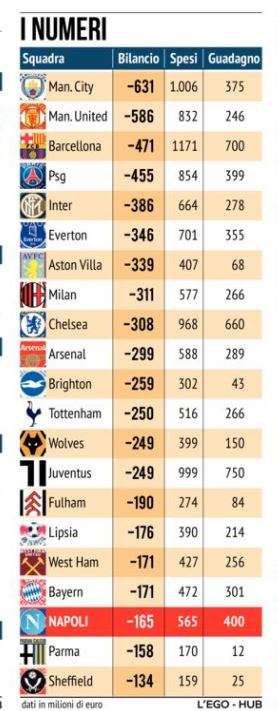 Le due formazioni di Manchester che lottano per il titolo in Premier League sono quelle europee con un maggior passivo: il City con un saldo negativo di 631 milioni (1006 milioni spesi e 375 incassati) e lo United che ha chiuso le ultime dieci sessioni di calciomercato a -586 milioni (832 milioni spesi e 246 incassati). Il terzo saldo di trasferimento più negativo dall’estate 2015 all’ultimo calciomercato è stato del Barcelona (-471 milioni di euro). Il Lille ha chiuso con un miglior saldo attivo (+191 milioni), club francese che ha ceduto in estate Osimhen al Napoli. R. Ventre – Fonte: Il Mattino