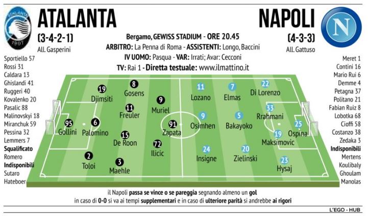 Ringhio a differenza dell’andata contro l’Atalanta quando propose la difesa a tre si affiderà al 4-3-3 anche perché nel reparto difensivo ha gli uomini contati: Koulibaly è indisponibile per la positività al Covid-19 (assente per lo stesso motivo anche Ghoulam) e Manolas si è infortunato alla caviglia contro il Genoa e dovrà restare fermo per un po’ di tempo fermo ai box. La coppia centrale verrà composta da Maksimovic, in difficoltà a Genova, e di Rrahmani che invece dopo l’esordio negativo contro il Verona ha dato segnali di ripresa domenica contro la formazione allenata da Ballardini. I due terzini saranno Di Lorenzo a destra e Hysaj a sinistra, in panchina è rimasto solo un altro difensore, il terzino sinistro Mario Rui: Gattuso ha convocato due giovani, Zedadka, terzino franco-algerino, 20 anni, rientrato dal prestito dalla Cavese e Davide Costanzo, difensore centrale classe 2002, un ragazzo di Frattamaggiore, dove è nato Insigne.