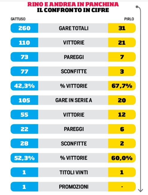 Gattuso/Pirlo: i due tecnici a confronto. Gare vinte, titoli, sconfitte e pareggi