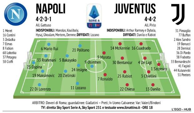 Bentegodi. E come trequartista ci sarà Lorenzo Insigne. O almeno così ha provato ieri pomeriggio e magari è solo una trappola per il suo amico Pirlo che sicuro si sarà informato. Ma in ogni caso il Napoli che va in campo alle 18 per la prima sfida alla Juventus nello stadio ora dedicato a Maradona, è da far ribollire il sangue: Zielinski arretra nella linea dei due centrocampisti davanti alla difesa (come già nel 6-0 con il Genoa) e al suo fianco avrà Bakayoko e in avanti spazio a Lozano e Politano con Insigne nel ruolo di trequartista o sottopunta come nel secondo tempo con l’Atalanta in Coppa Italia e come se lo immaginava Sarri nel primo mese napoletano. Prima di cancellare dalla mente il progetto. In avanti Osimhen. Insomma, o la va o la spacca. D’altronde, c’è poco da fare: perché solo Elmas e Petagna sono alternativa autentiche in questo lazzaretto che è in questi giorni il Napoli. D’altronde anche Fabian mica sta così bene in questa prima settimana di post Covid. Pino Taormin a (Il Matytino)