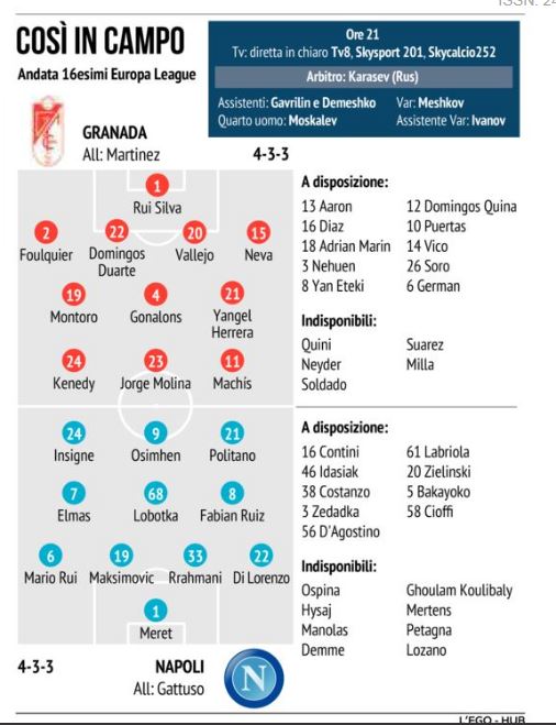 Si fa prima a dire chi non gioca di quelli che sono lì in Spagna: Zielinski e Bakayoko. Poi per il resto non ci vuole tanta fatica a mettere in campo il Napoli dei sopravvissuti e con ben 5 baby della Primavera che affronta l’andata dei sedicesimi di Europa League contro il Granada che pure ha una discreta carrettata di indisponibili.