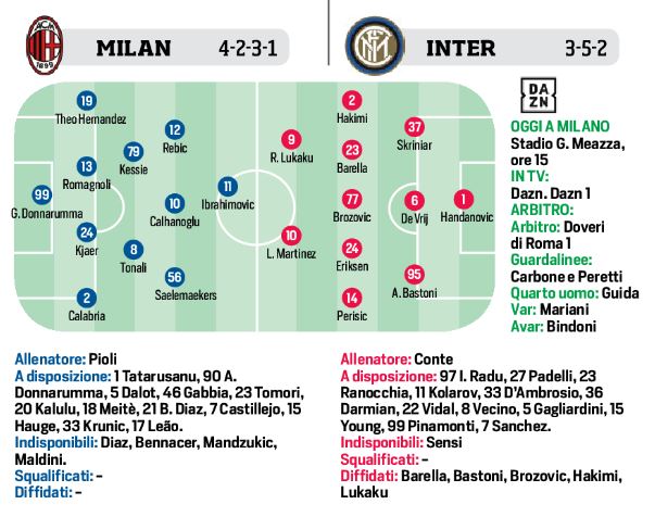 il punto di riferimento del giovane Sandro Tonali, mentre in difesa si rivede Davide Calabria dopo due gare d’assenza. Hernandez, Kjaer e Romagnoli dovrebbero comporre il resto del quartetto arretrato. E dopo aver incitato la squadra ieri a Milanello con cori e striscioni: “Novanta minuti all’assalto: il derby si vince”, oggi a San Siro il tifo organizzato accoglierà il pullman della squadra. Il club invece ha lanciato l’iniziativa a scopo benefico dei biglietti virtuali e sono stati venduti più di trentamila. Inoltre, ieri è stato svelato un murale di oltre 13×3 metri che colorerà gli spazi adiacenti al gate 14 dello stadio, con la scritta “Milan on fire”. A cura di Antonio Vitiello I tre dubbi di formazione dei quali in conferenza stampa ha parlato Antonio Conte, in campo non si sono visti. Nella rifinitura di ieri mattina, durante la quale è arrivata la notizia della scomparsa di Bellugi, tragico evento che ha scosso parecchio la dirigenza presente alla Pinetina, il tecnico pugliese è sembrato avere le idee molto chiare e oggi schiererà la stessa formazione che ha battuto la Lazio. Anche se Vidal è recuperato e convocato, in mezzo al campo sul centro-sinistra giocherà Eriksen, alla quarta di fila (Coppa Italia compresa) da titolare. A meno che l’ex ct non abbia in mente una sorpresa dell’ultim’ora, dunque, scontata la conferma in blocco per la linea difensiva formata da Handanovic, Skriniar, De Vrij e Bastoni; in mezzo, da destra a sinistra, largo a Hakimi, Barella, Brozovic, Eriksen e Perisic, mentre in attacco ci saranno Lukaku e Martinez. La squadra ieri è rimasta in ritiro alla Pinetina. Unico assente Sensi, alle prese con un affaticamento muscolare che lo ha messo ko nell’allenamento di mercoledì. and.ram. (Cds)