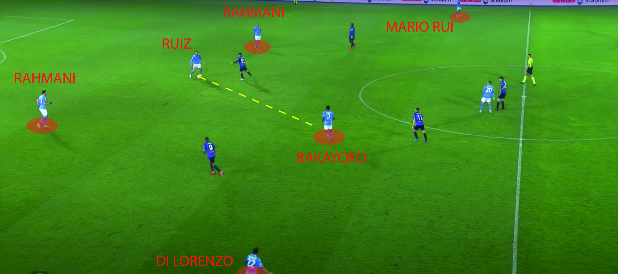 La colpa sul terzo goal è da addebitare ai due reparti, difesa e centrocampo. In quanto Ruiz riceve palla e nessuno fa movimento, ad eccezione di Bakayoko che viene incontro (figura 5). Quest’ultimo appoggia la palla per Ruiz, credendo che lo spagnolo avesse chiesto un uno-due per liberarsi da marcatura. Quando avrebbe, in base alla posizione del corpo che ha al momento di ricezione, potuto allargare il gioco per Mario Rui. Muriel che chiude bene la linea di passaggio per Di Lorenzo, mentre quest’ultimo se fosse salito di qualche metro avrebbe ricevuto il passaggio diretto da Ruiz. L’Attaccanta della Dea, recuperata palla punta Rahmani, lo salta e tira una fucilata di sinistro.