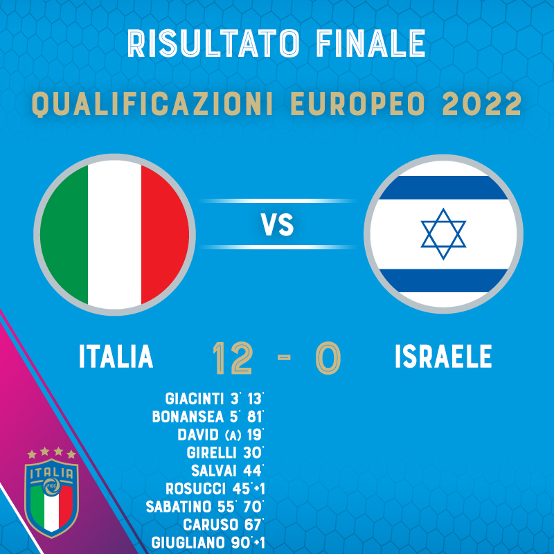 Oggi pomeriggio l’Italia aveva l’occasione contro Israele di qualificarsi ai prossimi Europei 2022 in Inghilterra e le azzurre hanno stravinto e dominato le loro avversarie. Nel primo tempo finisce 6-0: doppietta di Giacinti, poi una rete a testa di Bonansea, Girelli, Salvai, Rosucci su rigore e poi l’autorete di David. Nella ripresa l’Italia non si ferma e ne segna altri sei: doppietta di Sabatino, una dal dischetto, poi la neo entrata Caruso, poi ancora Bonansea e nel recupero Manuela Giugliano. Le azzurre volano agli Europei 2022 in Inghilterra come migliore seconda.