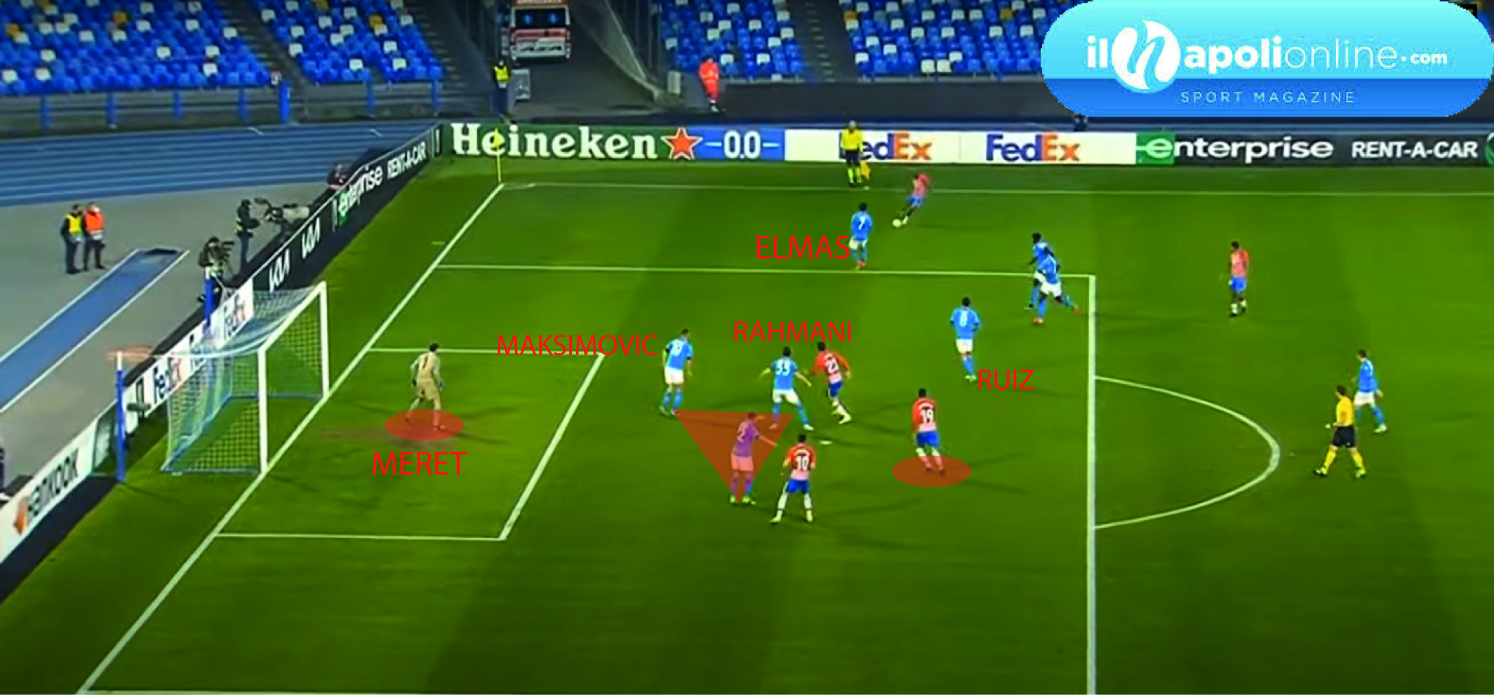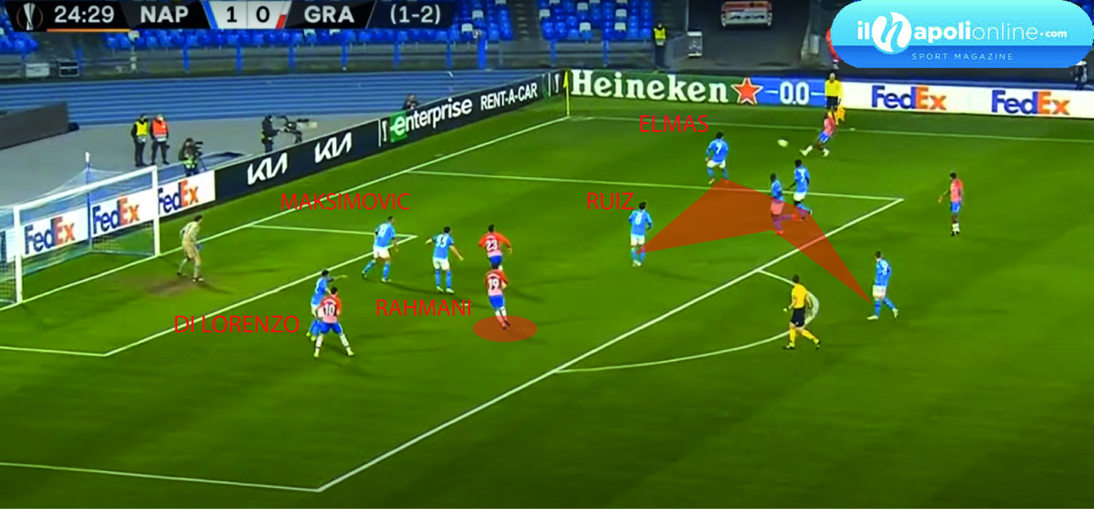 Analizzando il goal subito possiamo notare che ci sono ancora lacune sulla posizione in fase di non possesso. Infatti (figura 1), si nota che Elmas effettua un pressing in ritardo sull’esterno spagnolo; vicino a lui vediamo che ci sono Bakayoko, Koulibaly e Ruiz che creano superiorità in quella zona del campo, lasciando un 3 contro 3 davanti la porta difesa da Meret; quest’ultimo forse poteva chiamare meglio le marcature in area. Si nota (figura 2) anche che Rahmani segue il movimento di Molina, invece di lasciarlo a Maksimovic; lasciando Montero solo ed indisturbato per il pareggio del Granada.