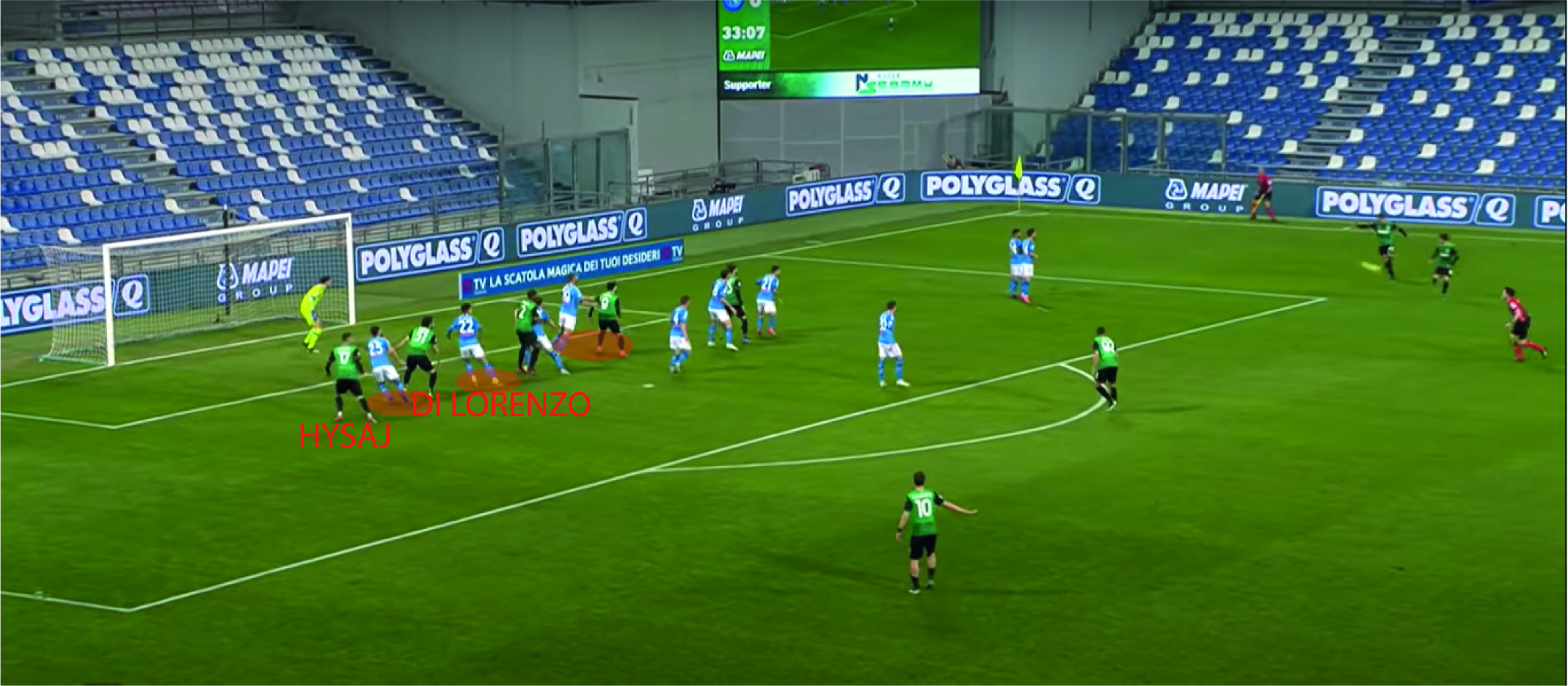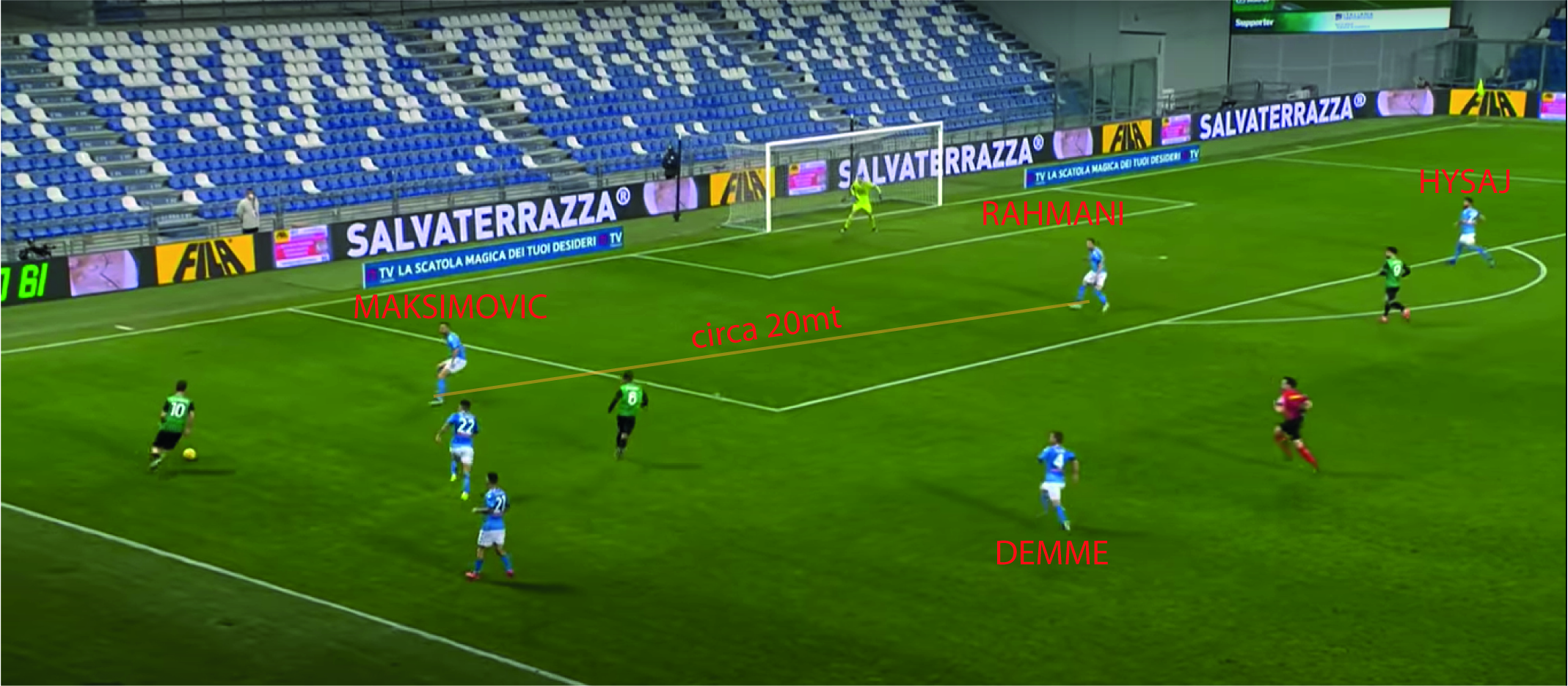 De Zerbi e il suo staff ha preparato bene anche i calci di punizione, infatti vediamo Maxime Lopez, muoversi come per calciare per poi tornare indietro. In modo da far muovere la difesa azzurra andando verso la porta così da creare confusione davanti al portiere. Inoltre vediamo (figura 1) che sul secondo palo Di Lorenzo ed Hysaj, lasciano ancora una volta l’uomo alle spalle libero. Ma andando a vedere meglio si nota ed i filmati a rallentatore sul movimento di Lopez, Caputo era marcato da Demme, il quale lo lascia libero restando in quella zona, così deve prenderlo Maksimovic e deve indietreggiare per primo verso la porta.