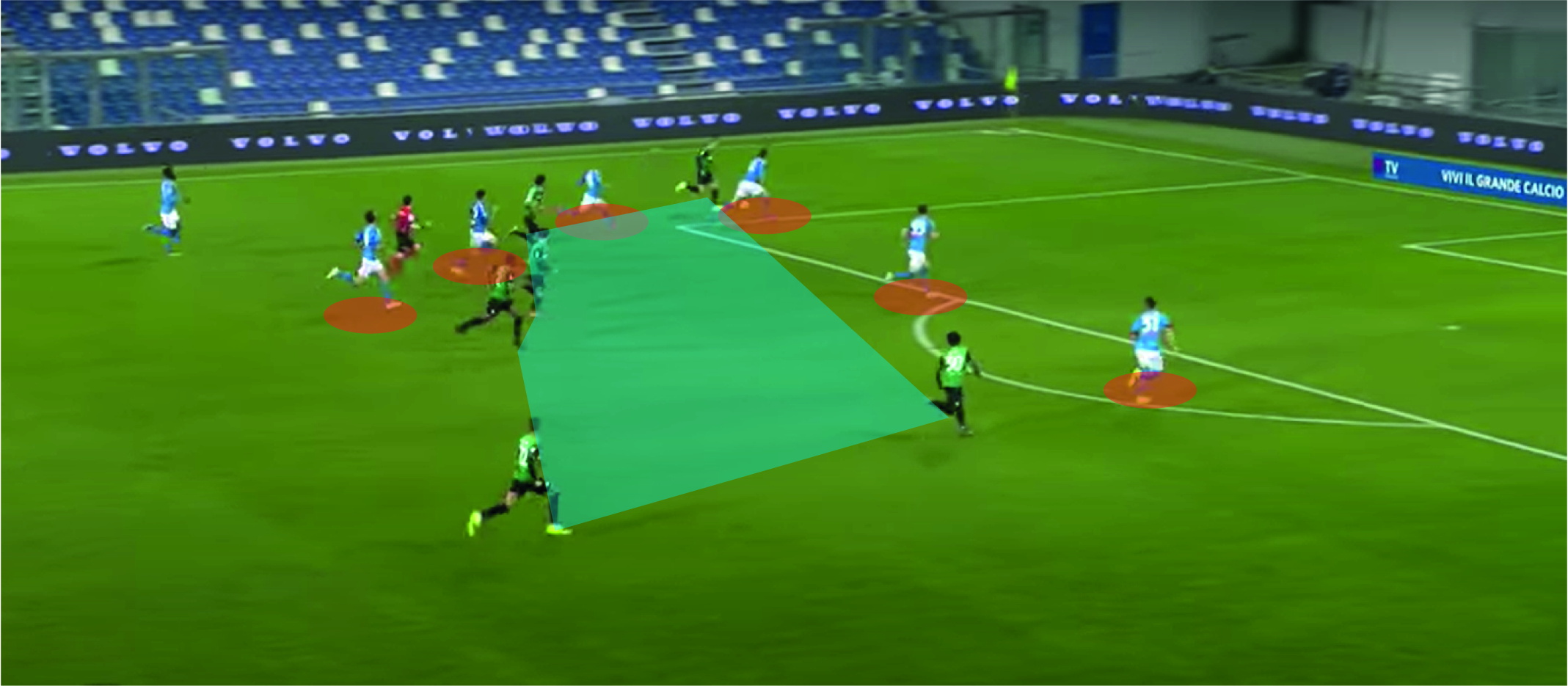 Sul terzo goal, la colpa è della mancanza di tranquillità che questa squadra fa fatica a trovare. Nessuno che ha gridato “CALMA” a Di Lorenzo nell’andare a battere il fallo laterale. La mancanza di lucidità nel dare palla lungo linea a Politano che l’avrebbe tenuta per subire un fallo. La palla viene data centralmente a Bakayoko che forse troppo sicuro di prendere fallo (forse lo era anche), perde palla per un contropiede fulmineo dei padroni di casa. Manolas che doveva solo accompagnare Haraslin sul fondo e magari concedergli solo il calcio d’angolo. Ma (figura 3) si vede 6 giocatori del Sassuolo attaccare la porta, contro 6/7 del Napoli.