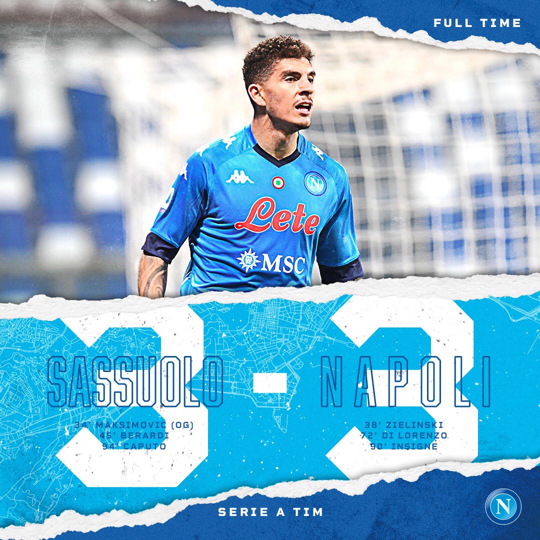 Sassuolo e Napoli chiudono 3-3 all’ultimo respiro in un pareggio che alla fine per gli azzurri ha il sapore amaro. Partita che comincia in altalenta e finisce sulle montagne russe all’ultima curva della Via Emilia. Segna per primo il Sassuolo con una punizione di Berardi che Maksimovic spizza nella propria porta in maniera sfortunata. Pareggia il Napoli con un sinistro delizioso di Zielo. All’ultimo minuto del primo tempo rigore per gli emiliani: Berardi chiude sul 2-1. Nella ripresa altra onda lunga di emozioni. Il Napoli pareggia con una spaccata di Di Lorenzo lanciato da un gran numero di Insigne. Poi al 90esimo Di Lorenzo guadagna un rigore netto e Lorenzo infila con freddezza il sorpasso dal dischetto: 3-2. I minuti di recupero sono 3, e proprio all’ultimo secondo ancora rigore per il Sassuolo per fallo di Manolas su Haraslin. Caputo inchioda il 3-3. E non c’è più tempo per proseguire, sennò chissà cos’altro sarebbe accaduto. Finisce con un pareggio che da un lato evidenzia la caparbietà azzurra di risalire e rimontare e dall’altro lascia il magone per un successo afferrato e poi sfuggito in un battito d’ali. Match, comunque, di spettacolo ed intensità. Si ricomincia domenica con Napoli-Bologna allo Stadio Maradona.