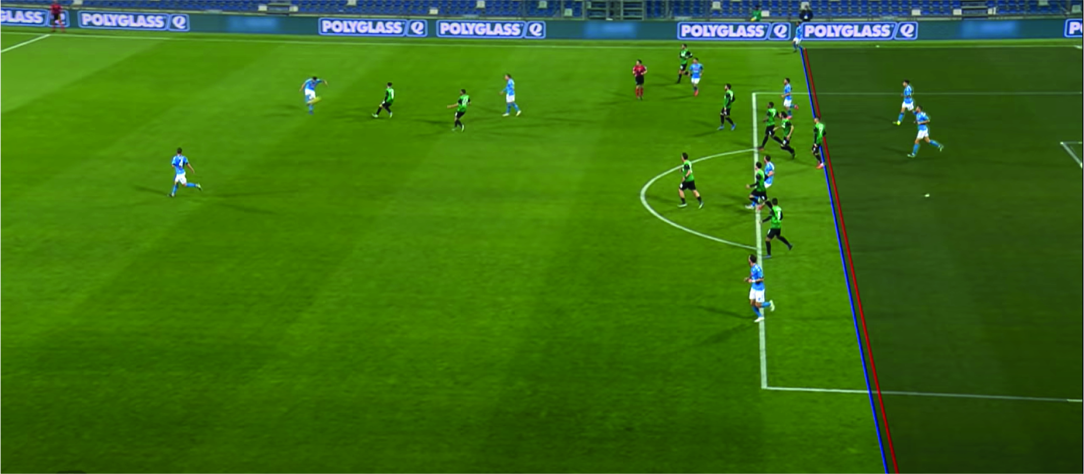 Così come il VAR è intervenuto sul fuorigioco millimetrico (figura 1) di Insigne del vantaggio azzurro, poi annullato. Che ha suscitato polemiche in quanto le linee sembrano non essere perfettamente dritte.