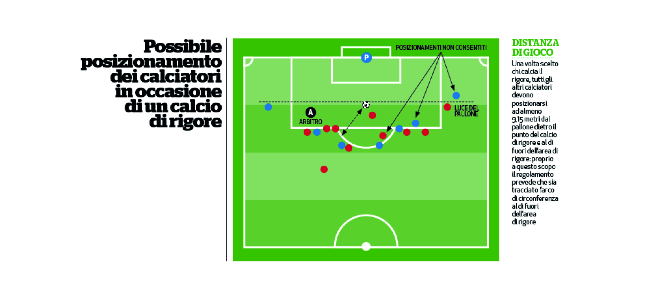 “Tutti i calciatori devono posizionarsi a 9,15 metri dal pallone (a questo scopo il regolamento prevede che sia tracciato l’arco di circonferenza di fuori dell’area di rigore), dietro il punto del calcio di rigore e al di fuori dell’area di rigore”