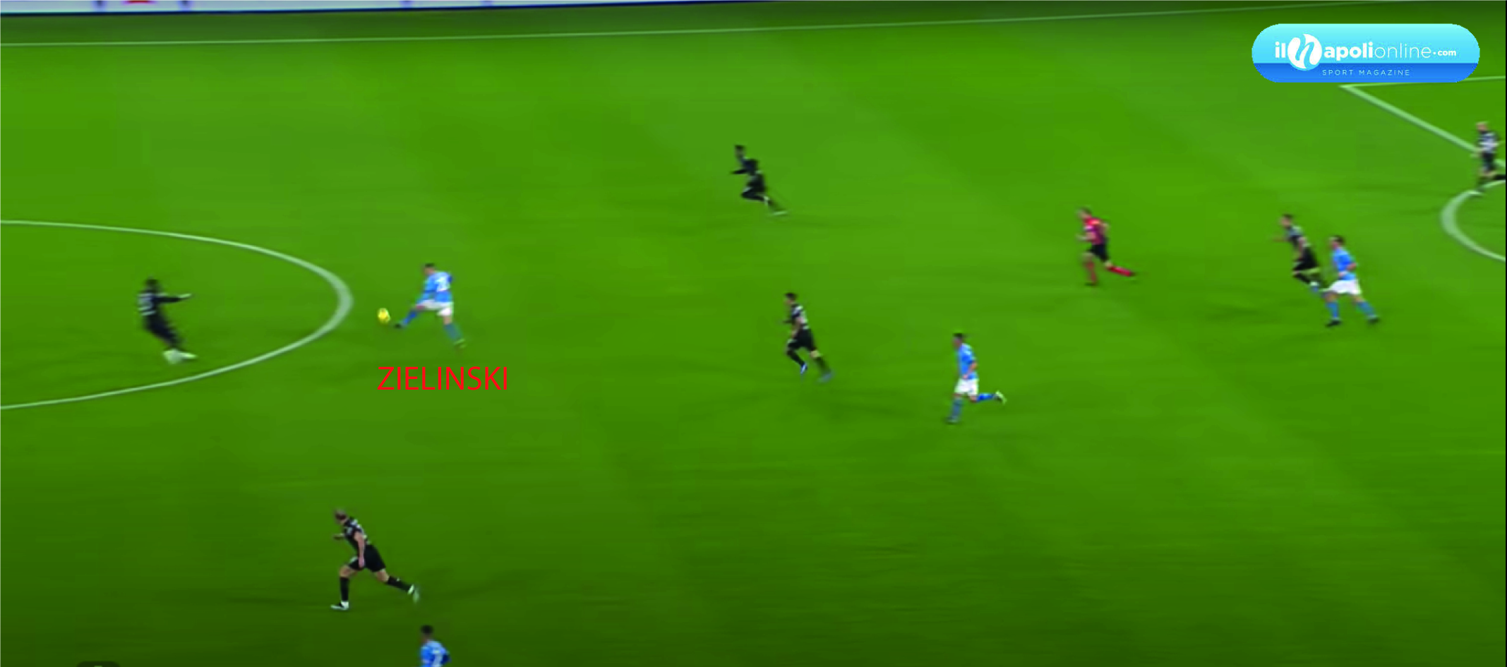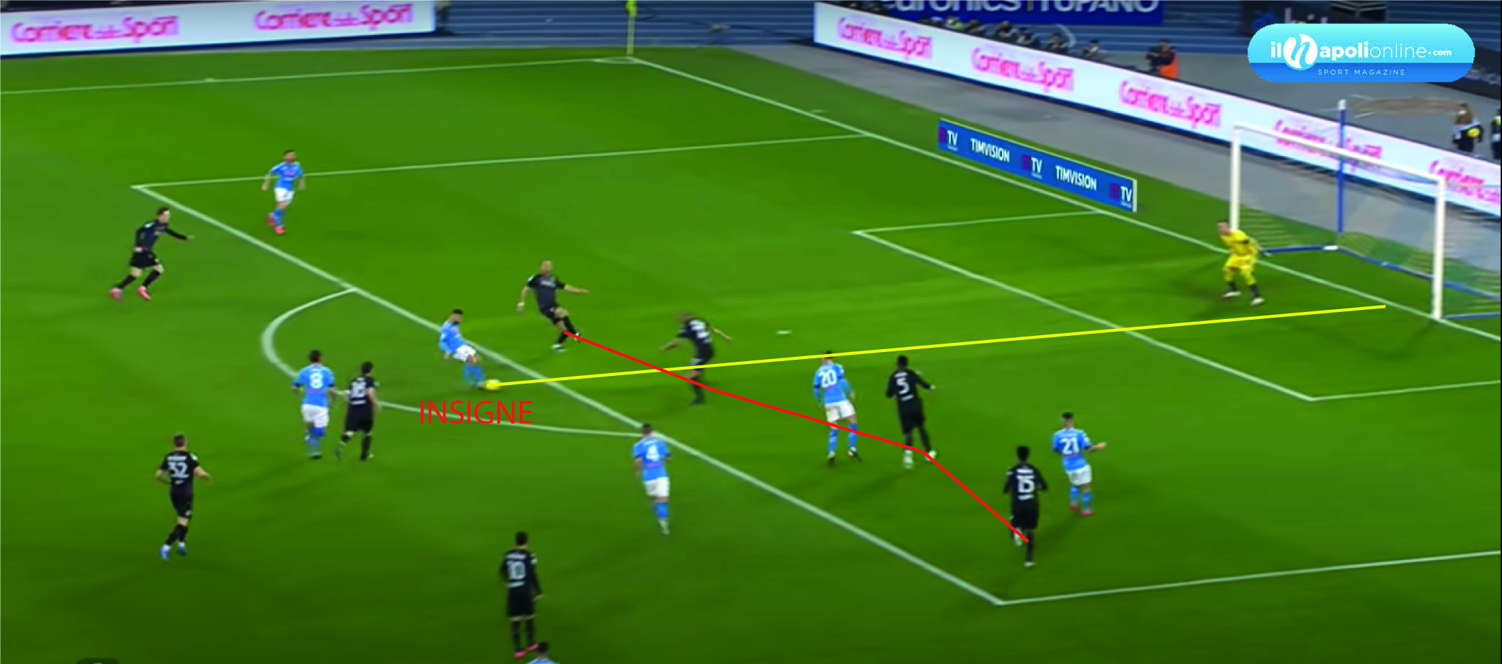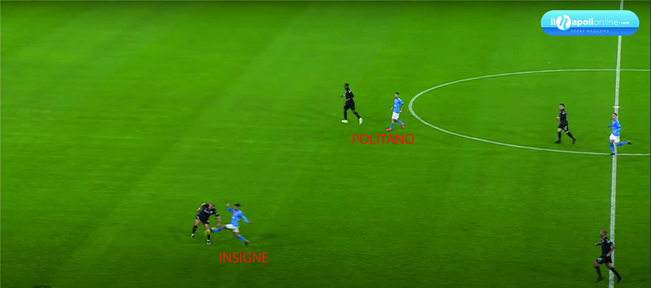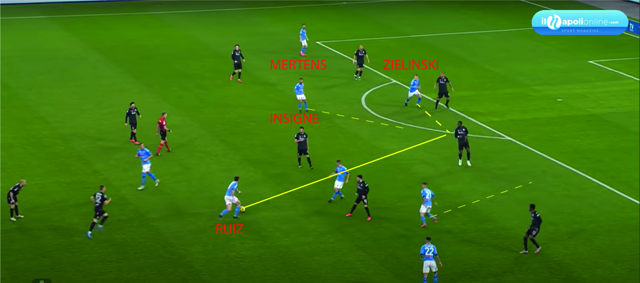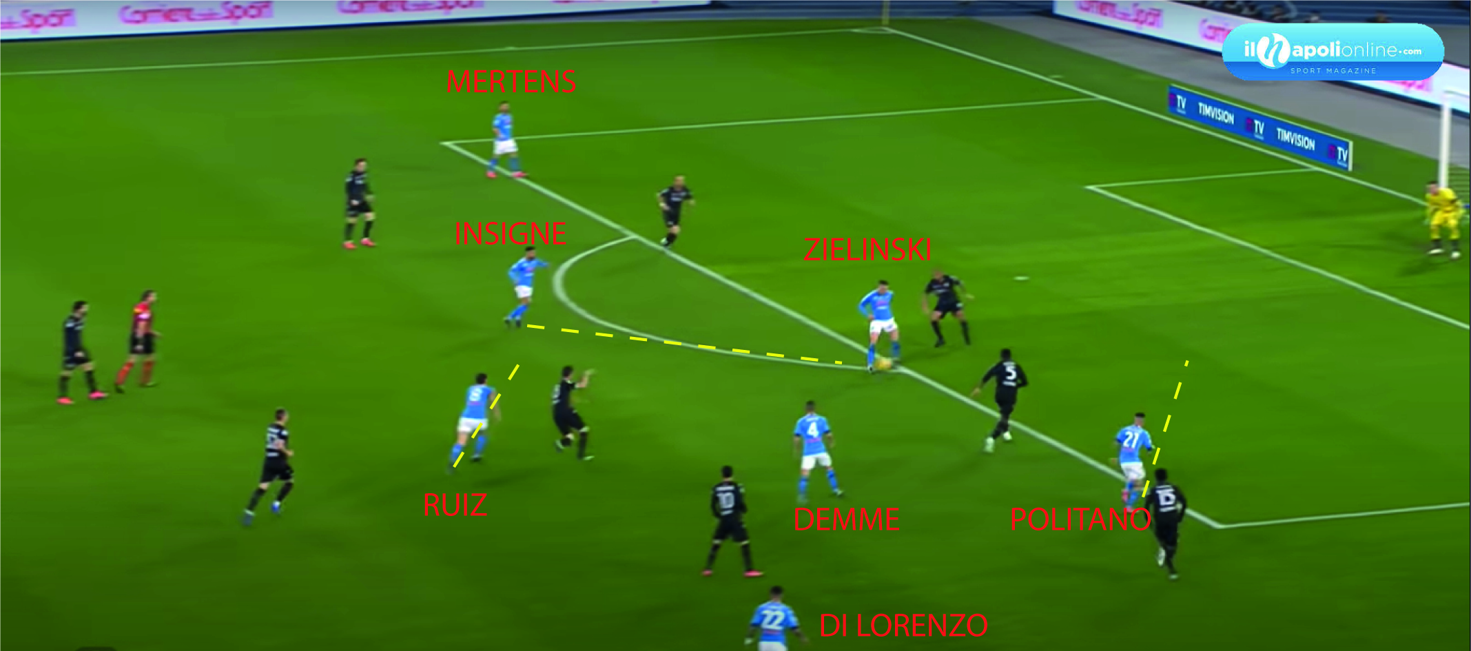 Mister Gattuso ha preparato la partita nella tre quarti avversaria con la Costruzione Alta, il primo goal ne è la prova, infatti con 3 passaggi (contando anche quello di Rahmani) ha avviato la costruzione alta per vie centrali con Ruiz (figura 1). Il movimento principale lo ha dettato Mertens, allargandosi per non dare punti di riferimento; nel frattempo Zielinski è andato a prendere il suo posto (figura 2); allo stesso tempo Politano ha attaccato la difesa avversaria, creando superiorità numerica (figura 3).