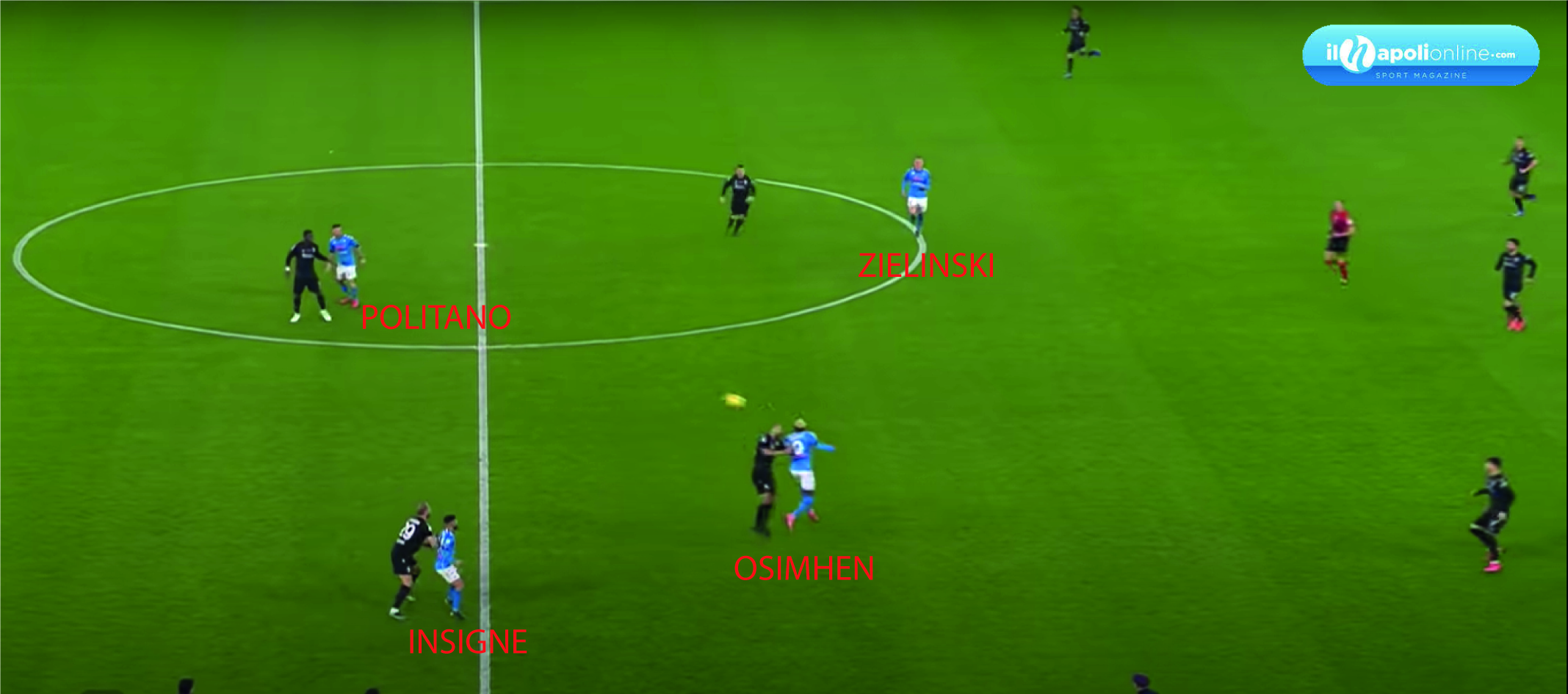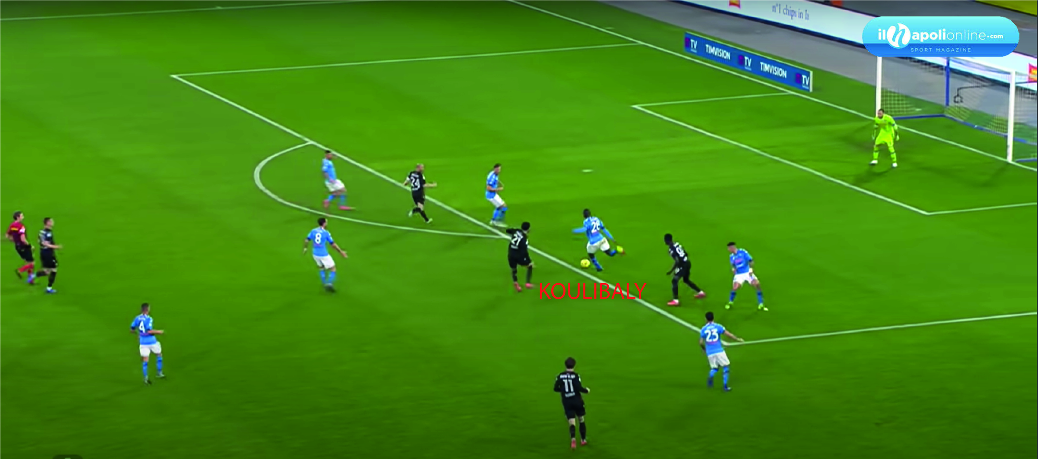 L’importanza di avere un centravanti alto che la prenda di testa o tenga palla, lo notiamo nei tanti rilanci dal fondo di Ospina e Koulibaly. Si cercava Politano, fino all’ingresso di Osimhen.