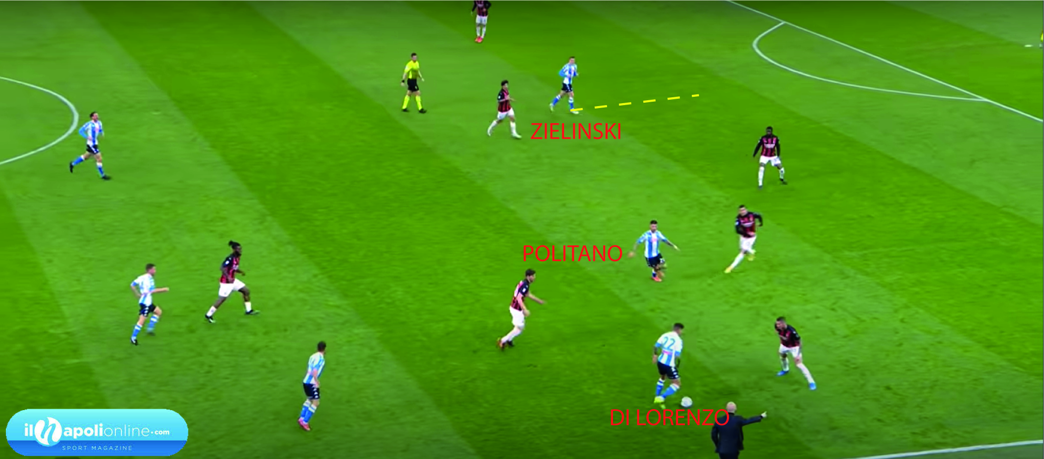Una prima azione significativa per il Napoli vede Mertens portare in giro i difensori del Milan, come ha fatto per tutto la partita. In questo caso specifico (figura 1) lascia palla a Di Lorenzo, il quale alzando la testa, vede il movimento di Zielinski (figura 2). Bravo Di Lorenzo a trovare lo spazio dietro Tomori che viene scavalcato. Zielinski non addomestica bene la palla, purtroppo la palla si allontana così il tiro non è dei migliori.