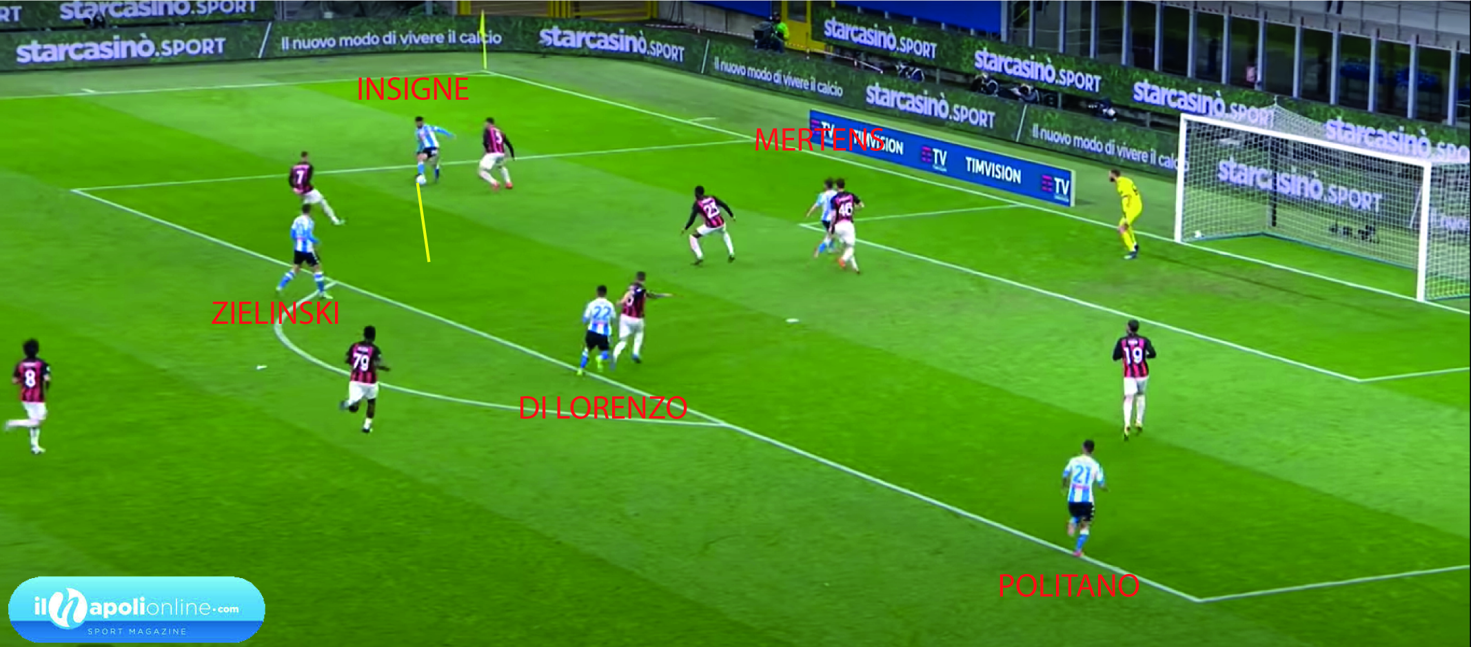 Ottima intuizione di Hysaj che intercetta un passaggio (figura 5), dove gli azzurri passano da una transizione negativa ad una positiva in men che non si dica. Infatti vediamo che in figura 5, gli azzurri correre verso la propria porta ad eccezione di Hysaj. Ma recuperata la palla, vediamo (figura 6), che i calciatori azzurri ripartono velocemente, attaccando la difesa del Milan addirittura in 6 contro 3. Hysaj lascia la palla a Zielinski che alzando la testa cambia gioco con un filtrante per Politano. Quest’ultimo colpendo anche male il pallone riesce a segnare.