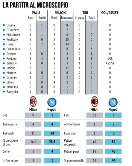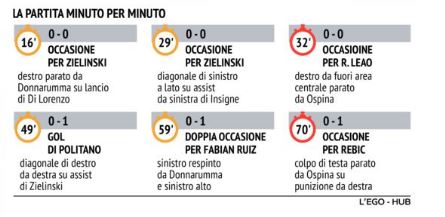 Impresa Napoli, batte il Milan e si rilancia in pieno nella corsa Champions League. Qualità, intensità e tanto cuore: gli azzurri vendicano il ko dell’andata, tirano fuori una prestazione di grandissimo spessore ritrovando il successo in trasferta che mancava dal 10 gennaio a Udine cancellando una lunga serie negativa. Gattuso, ex bandiera rossonera, torna per la prima volta al Meazza e fa un figurone indovinando tutte le mosse: il Napoli per un’ora domina, riesce a disinnescare gli avversari più pericolosi e a pungere in attacco. Il gol di Politano è la conseguenza logica della partita perfetta del Napoli in maglia modello Argentina. Poi dopo il vantaggio gli azzurri tirano fuori gli artigli per difenderlo e ci riescono grazie anche a qualche intervento decisivo di Ospina. Nel finale le proteste rossonere per un contatto in area tra Bakayoko e Theo Hernandez, l’arbitro Pasqua rivede l’azione al video richiamato dal Var e lascia proseguire confermando la sua prima decisione.