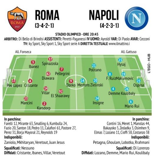 Roma/Napoli. Così in campo: Gattuso torna all’antico, Fonseca risponde con il 3-4-2-1