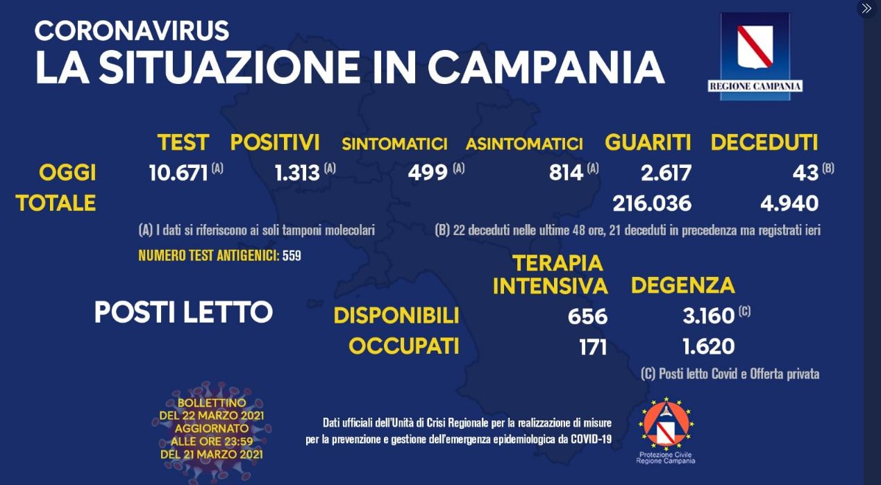 Campania, 1313 positivi su poco più di 10mila tamponi. Il tasso è al 12,3% Si contano altri 43 morti, di cui 22 nelle ultime 48 ore e 21 in precedenza ma registrati ieri. Alto il numero di guariti: sono 2.617.