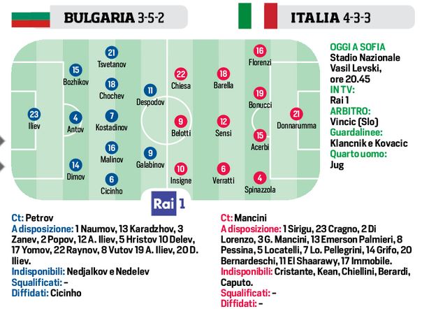 Questa sera a Sofia, si giocherà la seconda gara di qualificazione ai prossimi mondiali in Qatar 2022, tra i padroni di casa della Bulgaria e l’Italia. Il c.t. Petrov punterà in attacco sul calciatore dello Spezia Galabinov e su Despodov. Per il resto sarà 3-5-2, per cercare di non concedere spazio alla manovra dell’Italia. Per Roberto Mancini ci saranno alcune novità, ma una certezza, Insigne come pilastro dell’attacco. In difesa spazio ad Acerbi per Chiellini, Sensi al posto di Locatelli e Spinazzola al posto di Emerson Palmieri.