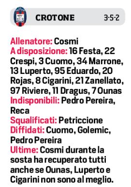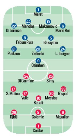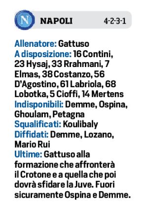 Il Napoli prosegue la preparazione a Castel Volturno, oggi torneranno tutti i Nazionali, carichi tra gol e assist, in vista del match contro il Crotone. Il tecnico degli azzurri Gennaro Gattuso dovrà fare a meno di Ospina e Demme, entrambi infortunati, ma nulla di serio, oltre che allo sfortunato Ghoulam. Bakayoko favorito per giocare la fianco di Fabian Ruiz. Per il resto al posto dello squalificato Koulibaly, giocherà Manolas con Maksimovic. In attacco Politano, Zielinski, Insigne, alle spalle di Osimhen. Per i calabresi ci sono i recuperi di Luperto e Ounas, mentre saranno out Pedro Pereira e Reca per le fasce. In attacco spazio al duo Simy e Di Carmine, con Messias nella mediana a cinque.