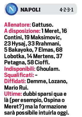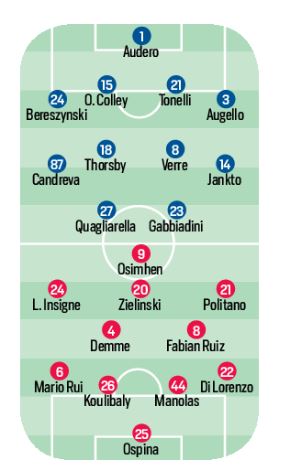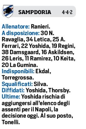 Domani pomeriggio allo stadio “Luigi Ferraris” di Genova, si giocherà la sfida tra i padroni di casa della Sampdoria e il Napoli. Per il tecnico dei liguri però rischia di non avere per la difesa il giapponese Yoshida, alle prese con una botta alla caviglia, favorito l’ex Tonelli. Per il resto out Ekhdal e Adrien Silva tra infortuni e squalifica. Verre affiancherà Thorsby. In attacco gli altri ex del match Quagliarella e Gabbiadini. Per Gattuso invece diversi i cambi. Ospina in porta, Manolas al centro, Mario Rui a sinistra. Infine l’attacco Politano e Osimhen favoriti su Lozano e Mertens, apparsi non al top contro la Juventus.