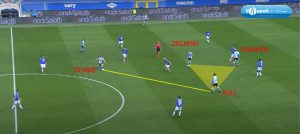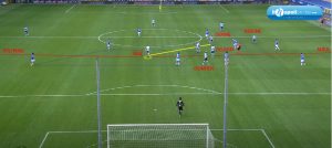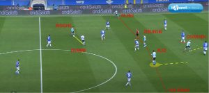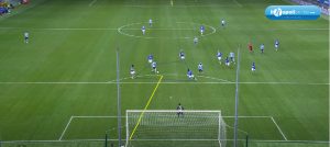 Fabian Ruiz si inserisce centralmente nell’enorme spazio lasciato dai blucerchiati (figura 3 – linea blu), e con uno scambio veloce ad un tocco, con Osimhen e Zielinski la palla ritorna allo spagnolo. Dopo aver fatto un tocco per stoppare e sistemarsi la palla (figura 4), scarica il sinistro a fil di palo portando meritatamente in vantaggio i suoi.