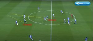 Il primo goal è davvero un capolavoro di squadra, vediamo sempre palla a terra, con delle giocate ad un tocco. Infatti l’Azione del goal parte con Insigne che riceve palla a centrocampo (figura 1 – cosa molto ricercata quando non trova spazio sull’esterno). Questo movimento permette agli azzurri di creare un’altra linea d’attacco, che si posizione tra la difesa ed il centrocampo avversario; la linea immaginaria (figura 1 e 3), si vede composta da Mario Rui, Zielinski, Fabian Ruiz e Politano, con Osimhen che fa da vertice, per creare una linea offensiva con una superiorità numerica.