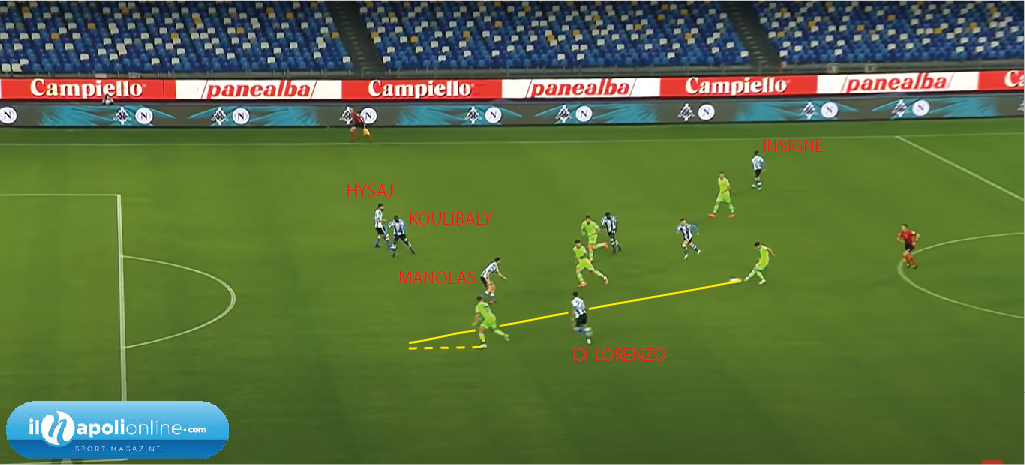Per non forzare la giocata in verticale, Zielinski prova a ritornare per far rifiatare la squadra perdendo palla (figura 1). Poteva cercare un uno-due, oppure giocare in ampiezza per Insigne a sinistra o per Di Lorenzo a destra che stava salendo. Ha scelto di girarsi e ripartire ma in un contrasto ha perso palla e la difesa è stata presa in controtempo (figura 2), infatti Di Lorenzo è più avanti rispetto alla linea di difesa.