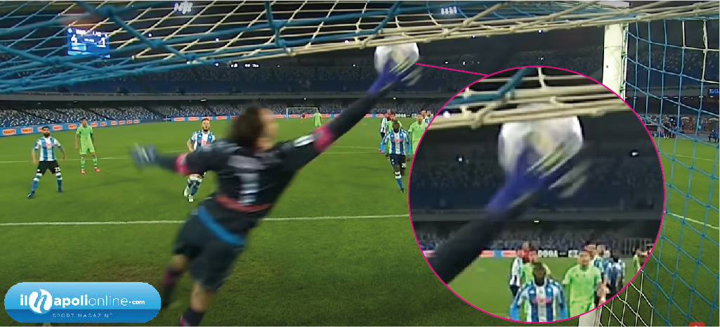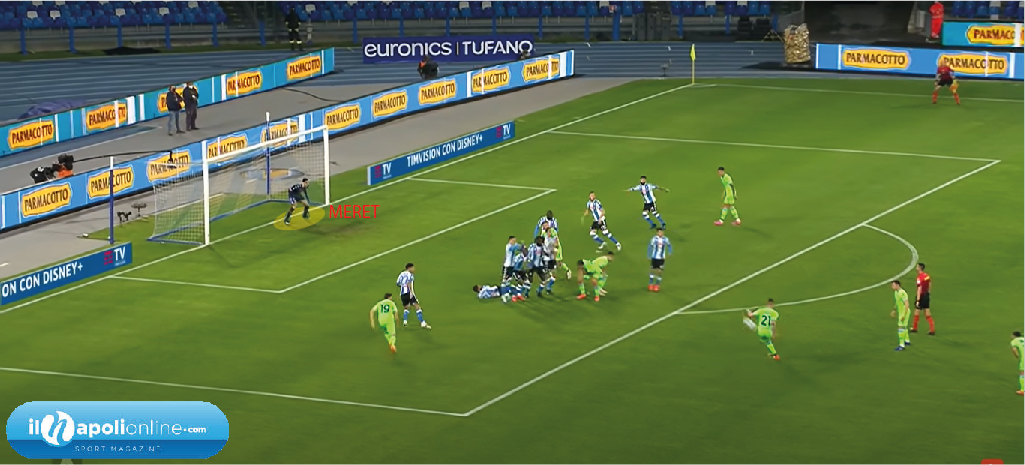 Un calcio di punizione di Milinkovic-Savic tirato molto bene, a superare la barriera, dove Meret è ben posizionato sulla partenza del tiro, e non fa il passo dietro la barriera (figura 3). Come molti portieri stanno facendo in quest’ultimo periodo. Il portiere azzurro ci era anche arrivato (figura 4), aveva fatto tutto bene, peccato per quella mano che se fosse stata qualche centimetro più su, sarebbe riuscito ad evitare il goal.