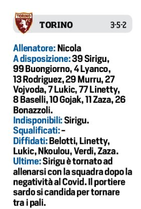Lunedì pomeriggio si giocherà la sfida valevole per la trentatreesima giornata, la gara tra il Torino e il Napoli, il classico testa-coda del campionato. Per il tecnico dei granata c’è il dubbio tra i pali, Milinkovic-Savic o il recuperato Sirigu dal Covid-19. Per il resto torneranno Ansaldi per la fascia sinistra e in attacco Ansaldi. In casa partenopea, oggi ritorno a Castel Volturno, probabilmente ancora out per infortunio Ospina, fuori per squalifica Manolas, mentre tornerà Demme a centrocampo. Lozano parte favorito per la fascia destra su Politano, mentre in attacco spazio ancora a Mertens.