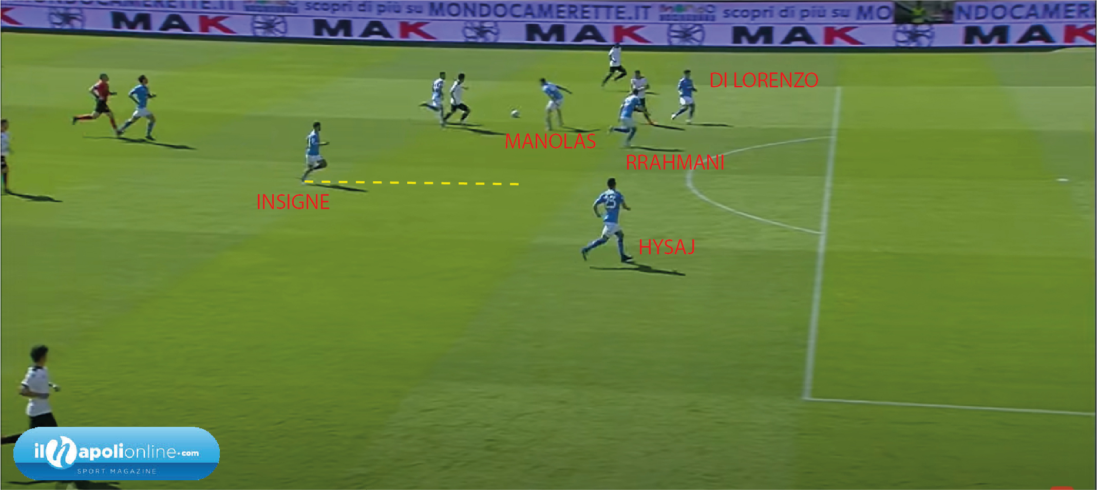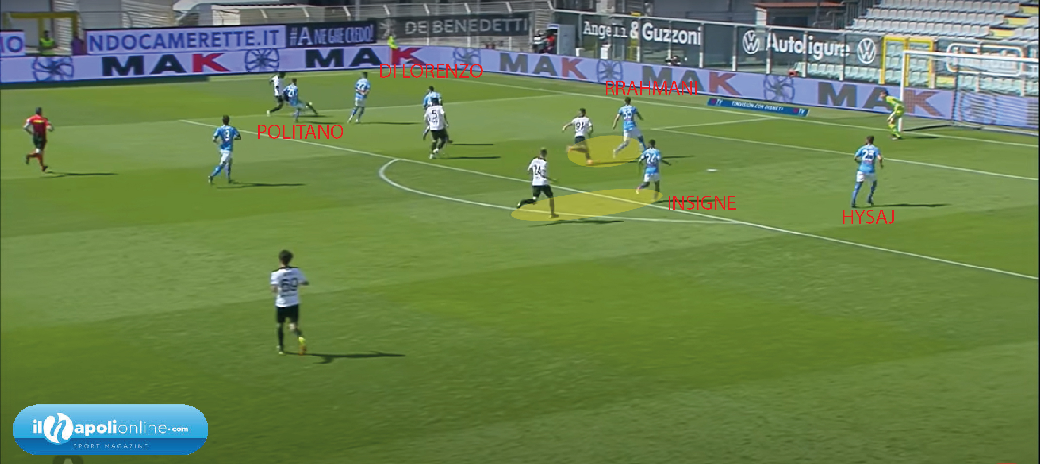 Goal subito su un ripiegamento che và un rivisto. Infatti Manolas rompe la linea difensiva per far allargare il gioco avversario (figura 8). Nel frattempo vediamo Insigne che viene a fare una fase difensiva dove poco può sul goal. Infatti (figura 9) si trova lui a dover marcare di testa, quando magari avrebbe potuto far cambio marcatura con Hysaj e marcare lui l’uomo sul secondo palo. Meret stava per riuscire anche nel miracolo ma la palla finisce sui piedi di Piccoli che può solo insaccare.
