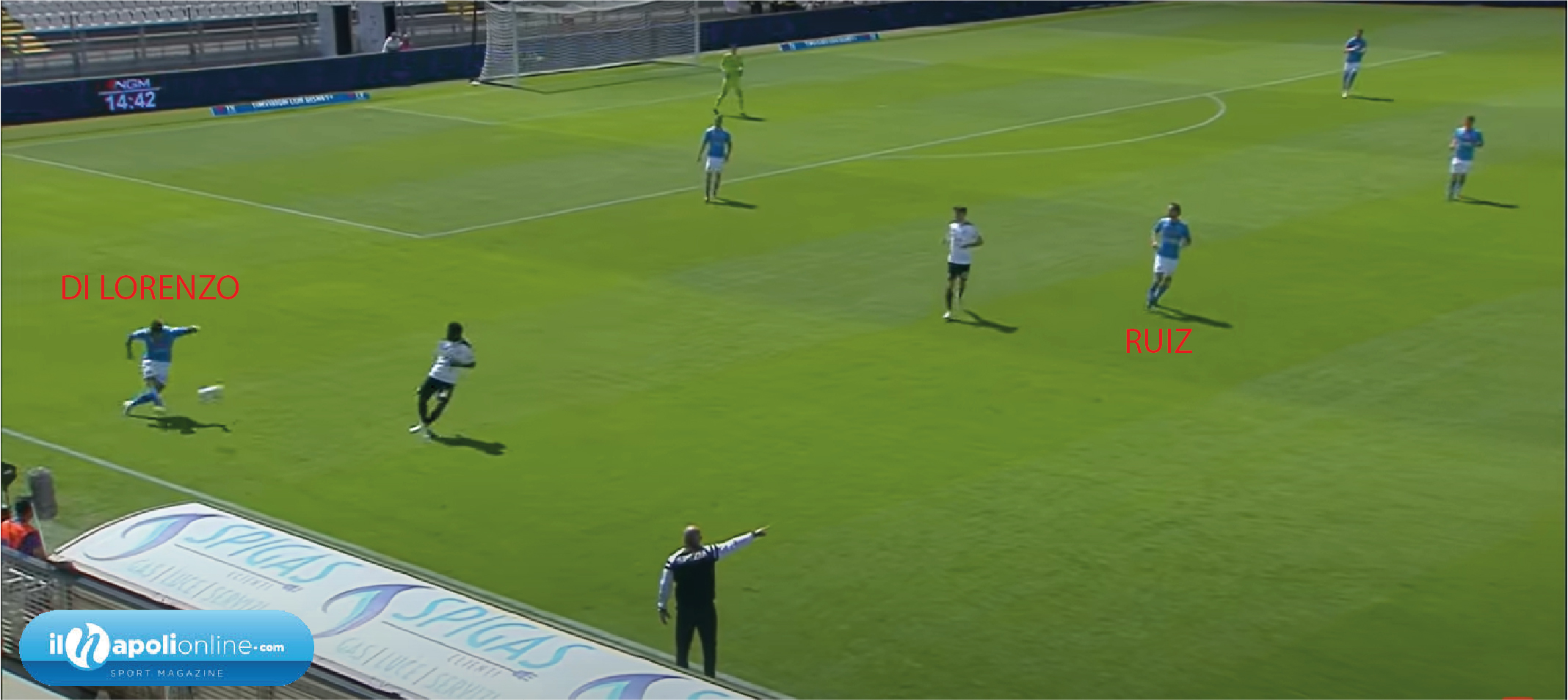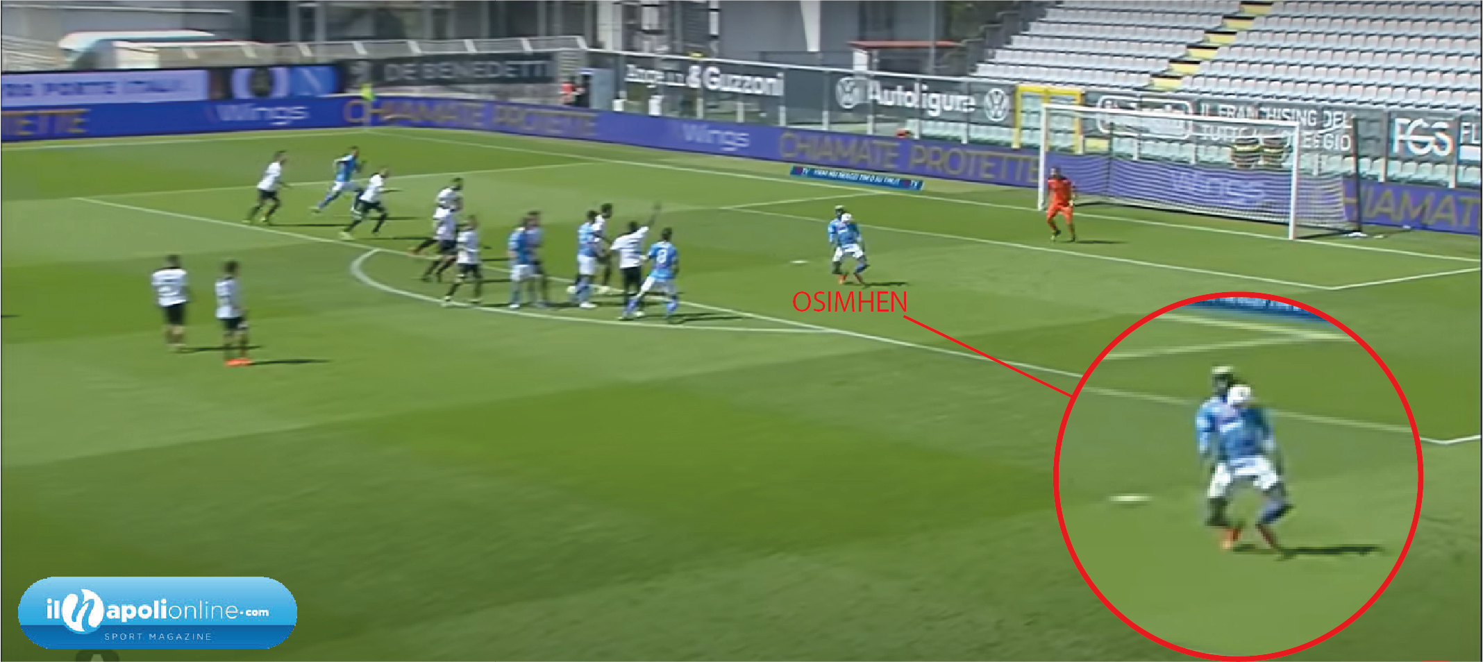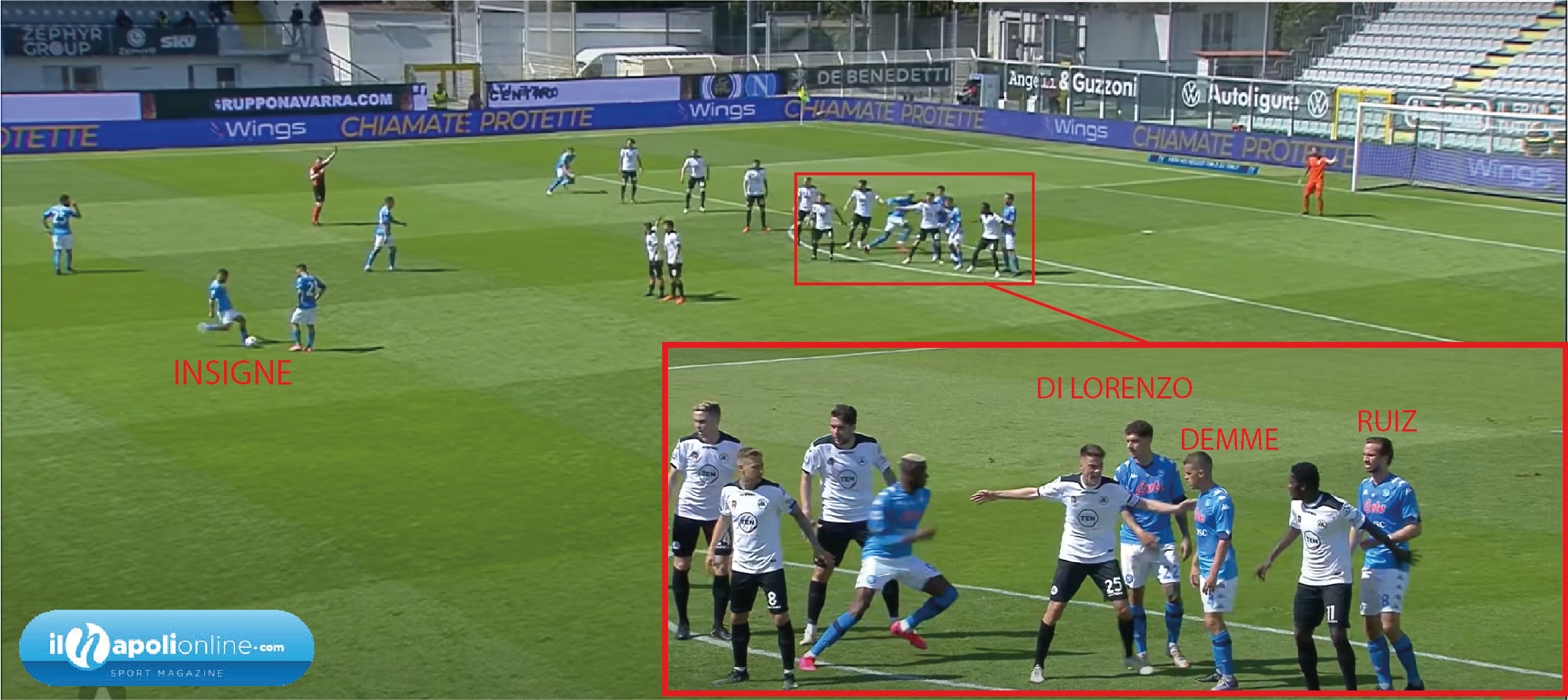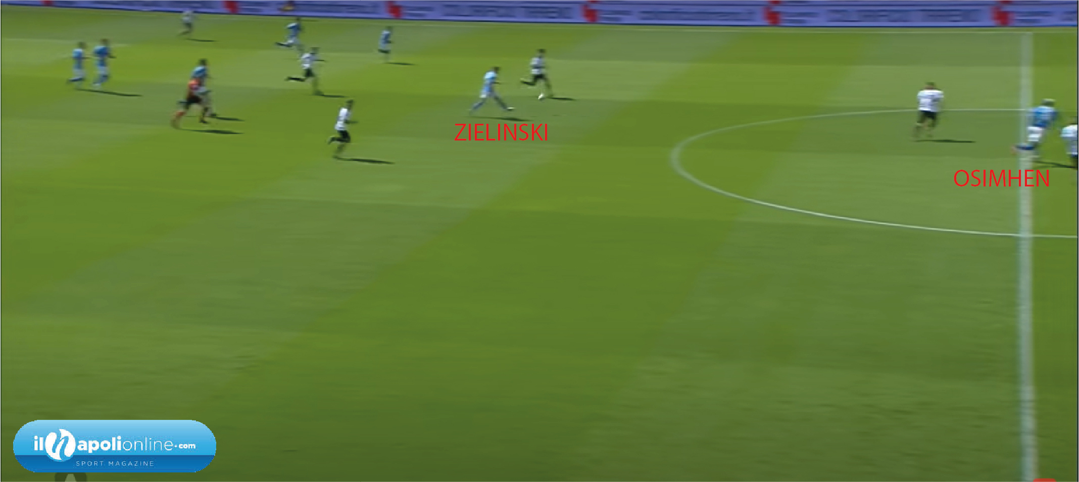 Una punizione studiata e provata da mister Gattuso ed il suo staff. Prima di partire infatti si nota Politano alzare entrambe le braccia per chiamare lo schema. Ma è Insigne a battere la punizione, e vediamo Demme, Ruiz, e Di Lorenzo (figura 6) creare un “blocco” ai difensori. Nel frattempo Osimhen con tempi perfetti scatta e con un ottimo stop (figura 7) si gira e scaraventa un potente sinistro sul quale il portiere avversario non ha colpe.