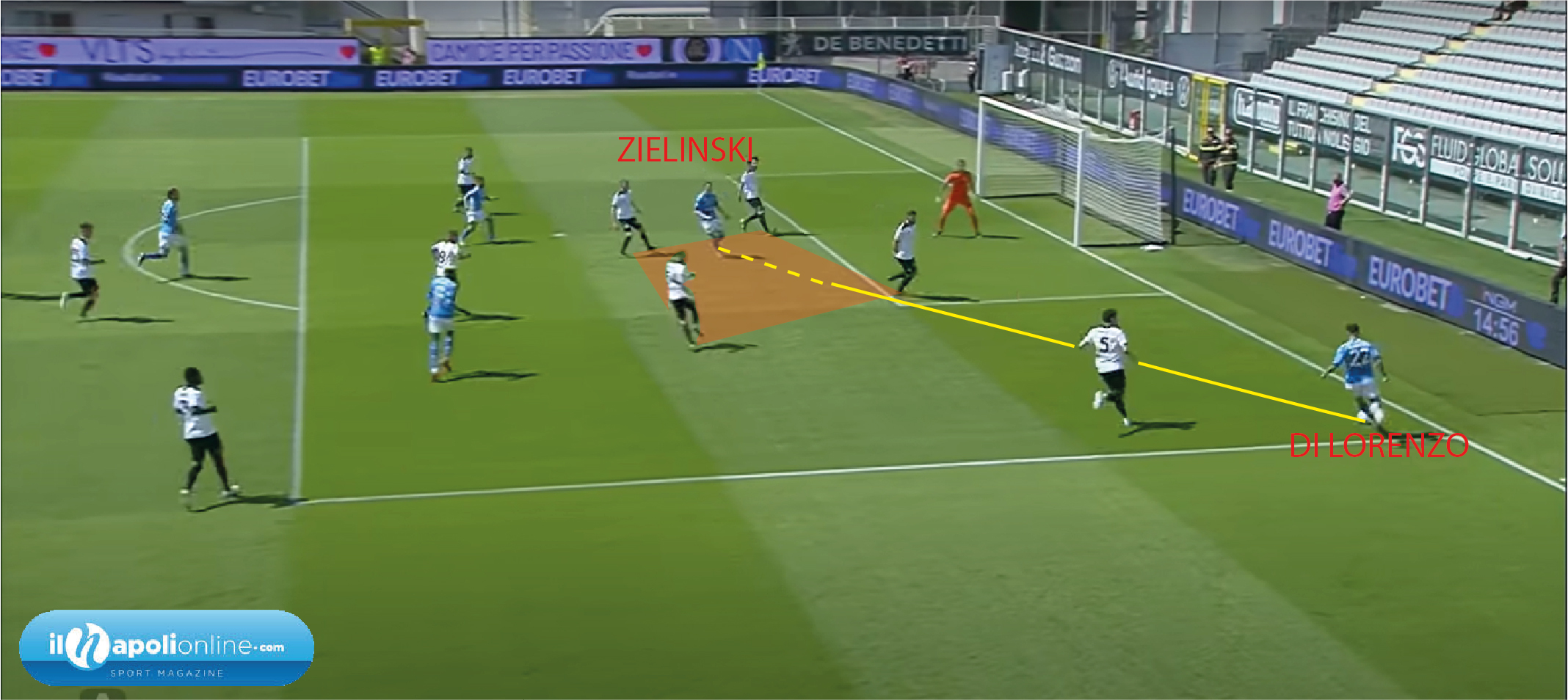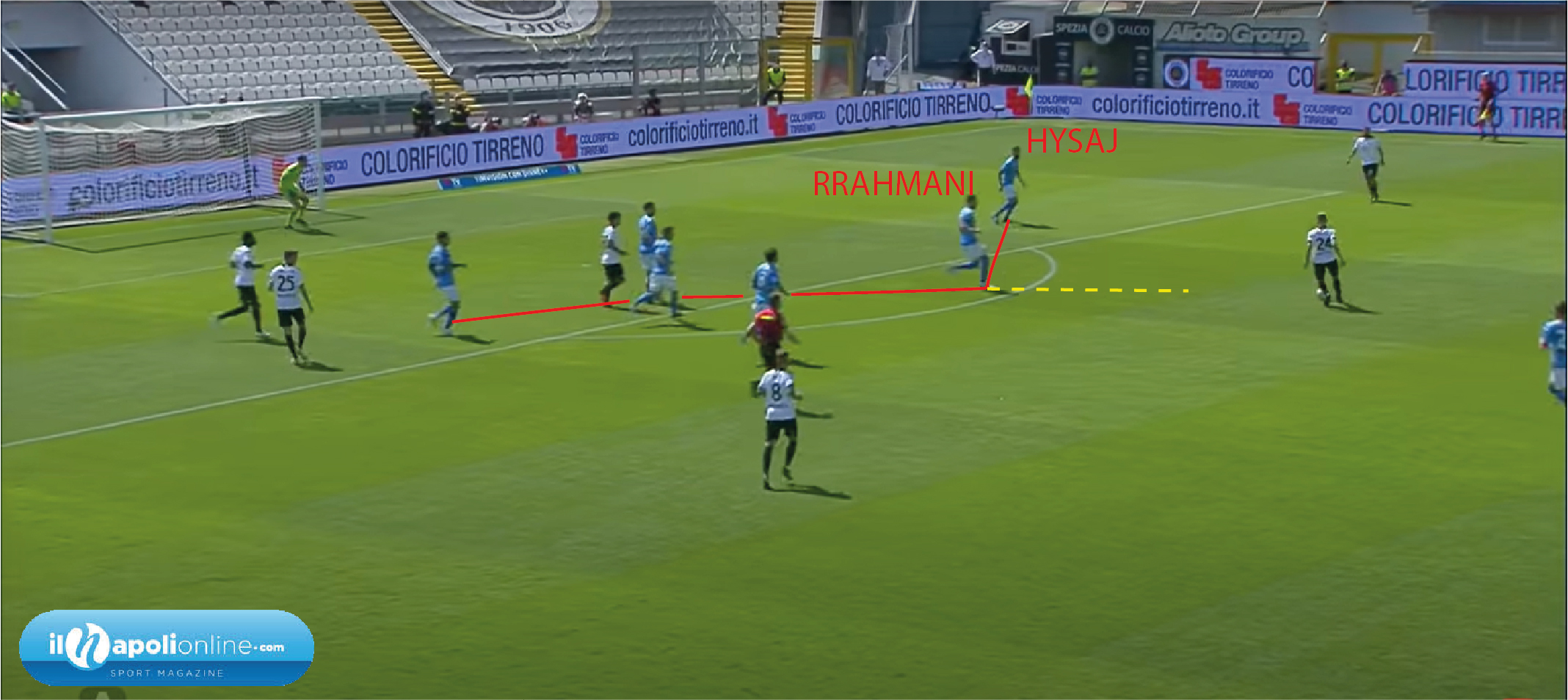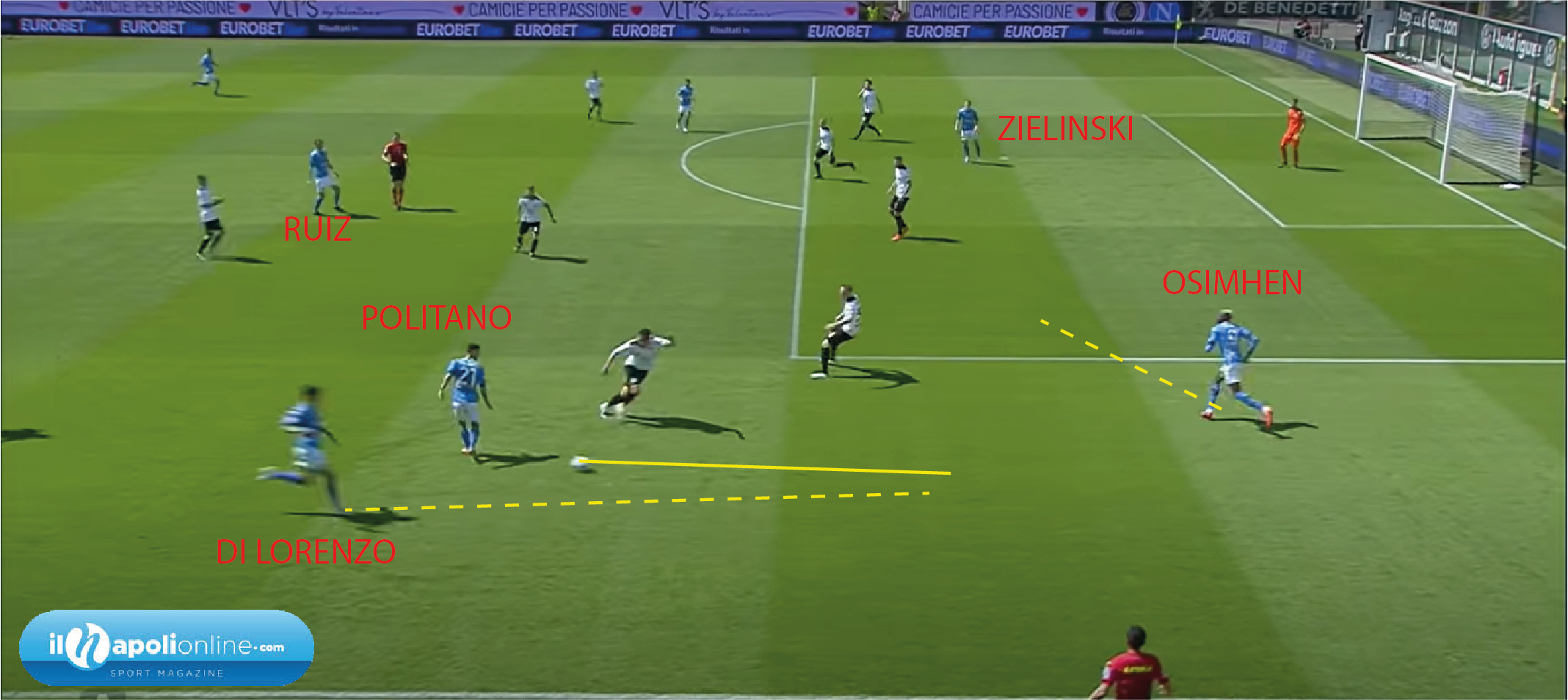 Rrahmani rompe la linea difensiva per chiudere la giocata del centrocampista spezzino (figura 4), ben facendo. Così facendo impatta il tiro avversario e la palla finisce a Zielinski che senza pensarci e con due tocchi (figura 5) lancia Osimhen. In perfetto tempismo evitando il fuorigioco e partendo addirittura prima del centrocampo. L’attaccante azzurro con la sua velocità arriva da solo davanti al portiere avversario per poi spiazzarlo ed insaccare per il raddoppio.