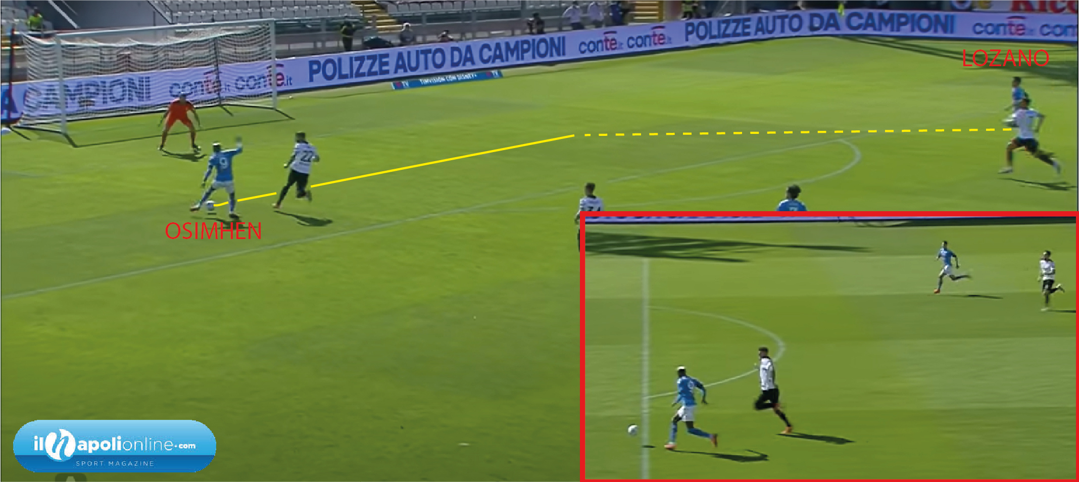 Quarto goal che parte da un lancio di Mario Rui per Osimehn (figura 10) che è in gioco di poco. L’attaccante azzurro porta palla ma questa volta sa che sta arrivando il compagno, infatti (figura 11) si vede che guarda di lato e gli serve un pallone d’oro che Lozano deve solo appoggiare in rete per il poker finale azzurro.