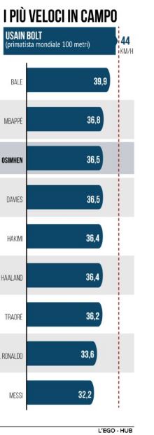 Una vera e propria forza della natura, perché su un campo da calcio pochi riescono a toccare queste velocità: Bale è il Re incontrastato dello sprint con i suoi 39,9 di picco massimo, ma tutti gli altri campioni inseguono, da Hakimi a Haaland (36,4 km/h), da Cristiano Ronaldo (33,6 km/h) a Messi (32,2 km/h). Bolt, il velocista che ha annichilito il mondo frantumando tutti i record negli ultimi anni, si è spinto fino ai 44 km/h in una notte di Berlino di qualche anno fa.