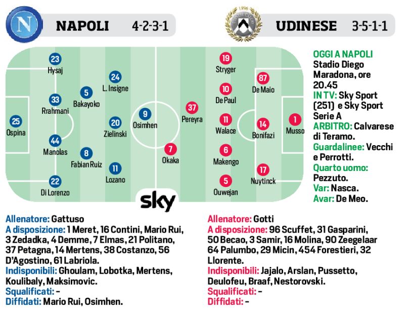 Questa sera allo stadio Diego Armando Maradona, fischio d’inizio alle ore 20,45, il Napoli punterà ad un altro successo per restare in piena zona Champions. Avversario l’Udinese, matematicamente salvo, ma che giocherà con la giusta serenità. In casa azzurra, Gattuso effettuerà cambi di formazione. Ritorno di Ospina in porta. A centrocampo e in attacco le altre novità. Bakayoko al posto di Demme, Lozano in vantaggio su Politano. Il tecnico dei friulani Gotti dovrà fare a meno anche di Arslan, al suo posto il giovane Makengo. In attacco Pereyra dietro all’unica punta Okaka, Llorente partirà dalla panchina.