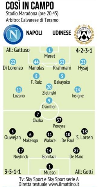 sono andati in ritiro. In difesa ballottaggio tra Mario Rui e Hysaj per il ruolo di terzino sinistro, in attacco stavolta Lozano è favorito su Politano. A centrocampo è in corsa per una maglia da titolare Bakayoko che potrebbe partire dall’inizio al posto di Demme in coppia con Fabian Ruiz. Mertens ieri si è allenato in gruppo, ha smaltito l’infortunio alla caviglia accusato con lo Spezia ma andrà inizialmente in panchina: giocherà Osimhen, il grande trascinatore delle ultime partite che è arrivato a quota 10 reti in campionato. Devastante contro lo Spezia, impossibile da fermare per i difensori avversari: è andato via mille volte in profondità, ha segnato una doppietta e servito un assist d’oro a Lozano. Proverà a dare continuità in termini di gol e a essere ancora decisivo con l’Udinese. Osimhen però è diffidato e per lui c’è il pericolo ammonizione, un giallo gli farebbe saltare la prossima sfida contro la Fiorentina. R. Ventre (Il Mattino)