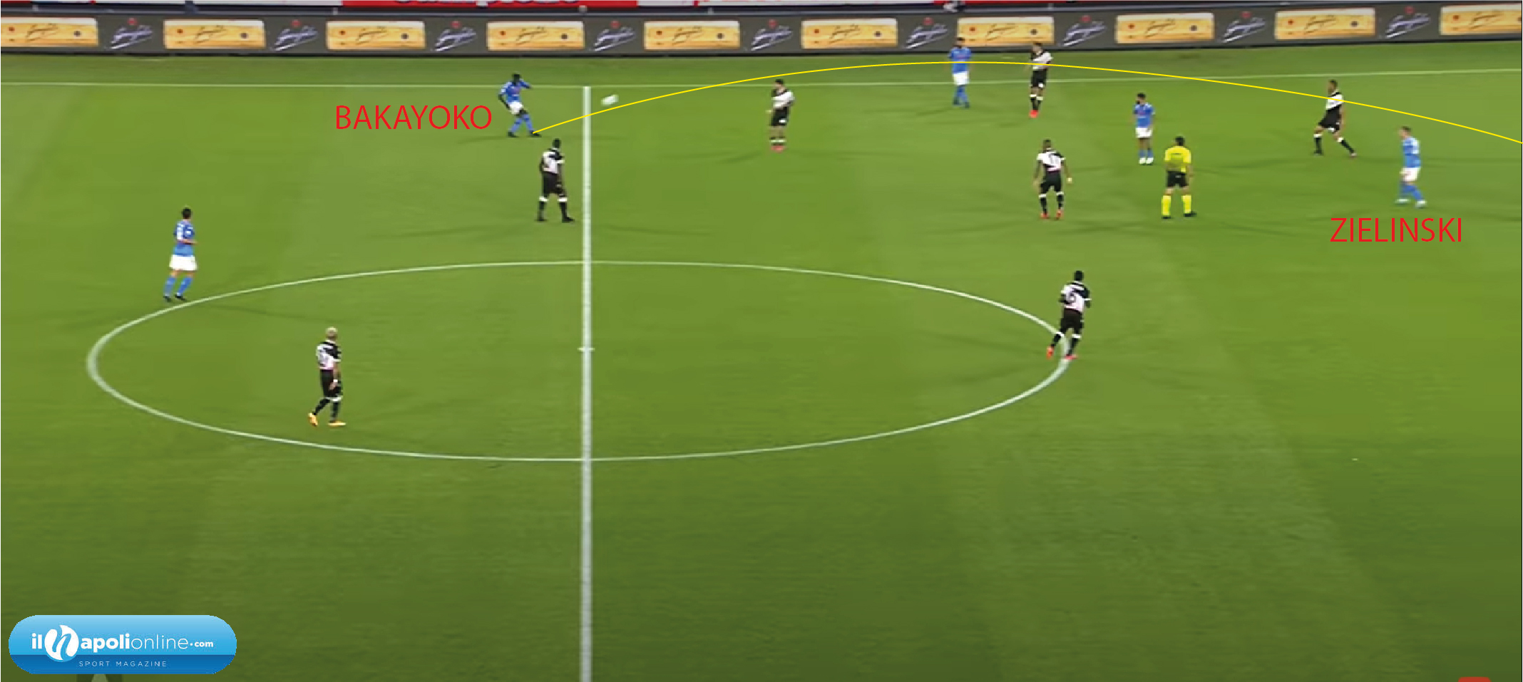 Lancio di Bakayoko (figura 1) sulla punta centrale Osimhen, questo si appoggia a Zielinski (figura 2). Ed il polacco con un colpo di testa gli restituisce la palla, generando un 1 contro 1 tra attaccante e difensore. L’attaccante azzurro tira ma il portiere pare, dopodichè sulla respinta ci arriva Zielinski che colpisce per il vantaggio.